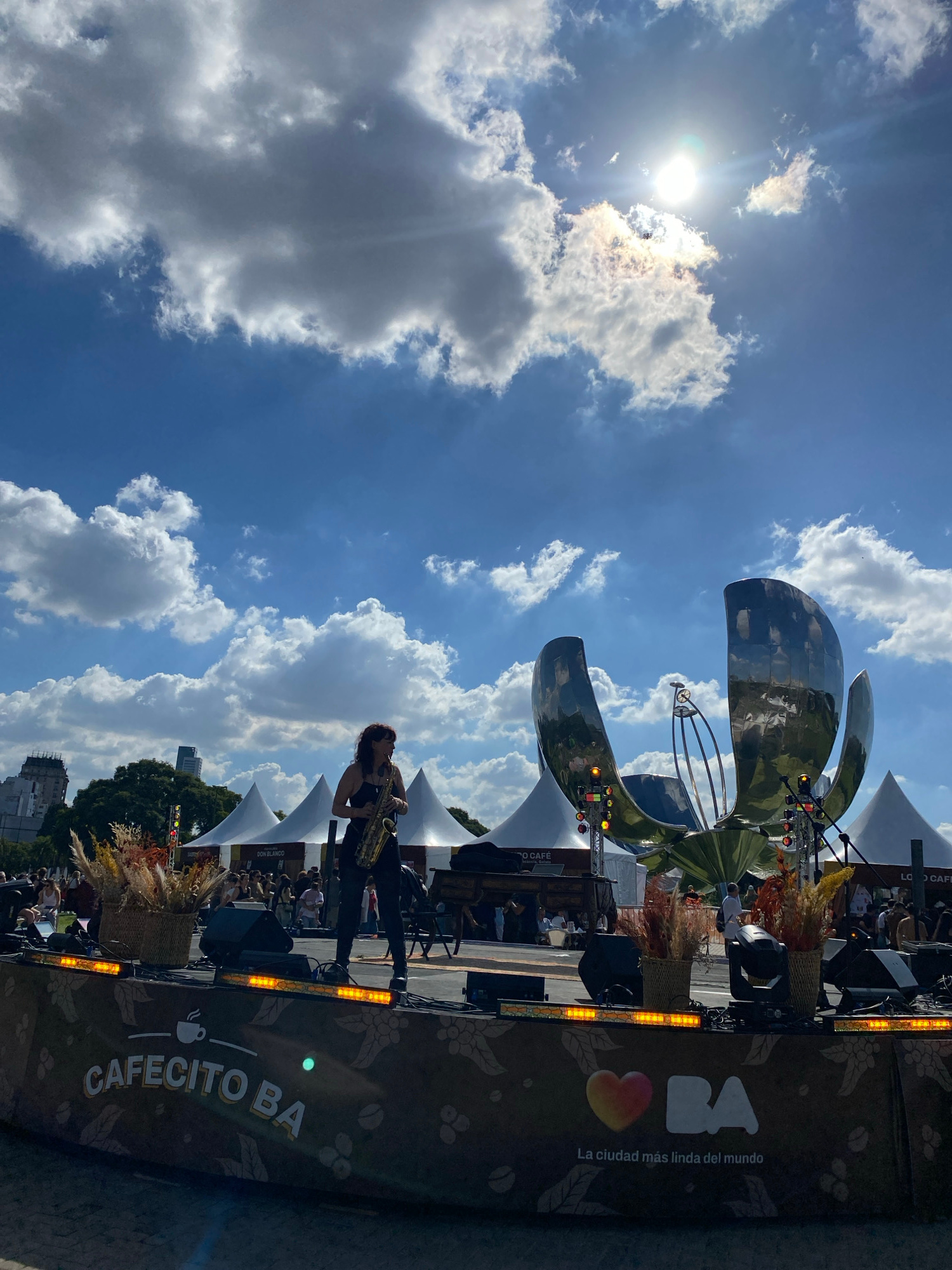 The image depicts a vibrant outdoor event in Buenos Aires, Argentina, under a bright, partly cloudy sky. The sun, partially obscured by clouds, casts a strong light over the scene. In the foreground,…read more
