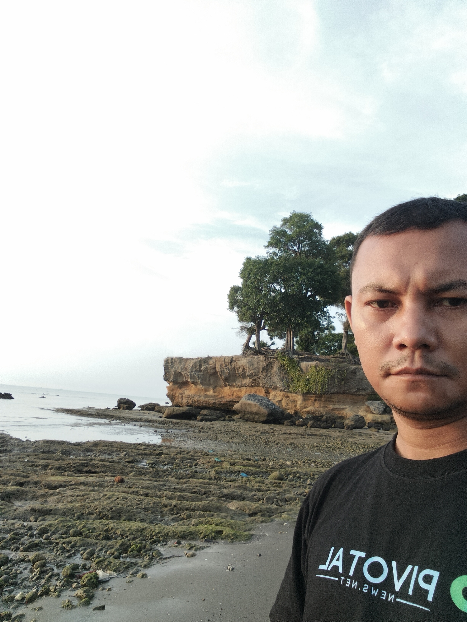 A man takes a selfie at the rocky beach of Lhokmanee, Indonesia. The tide is low, revealing a textured, rocky shoreline covered in patches of algae. In the background, there is a small cliff with treeβ¦read more