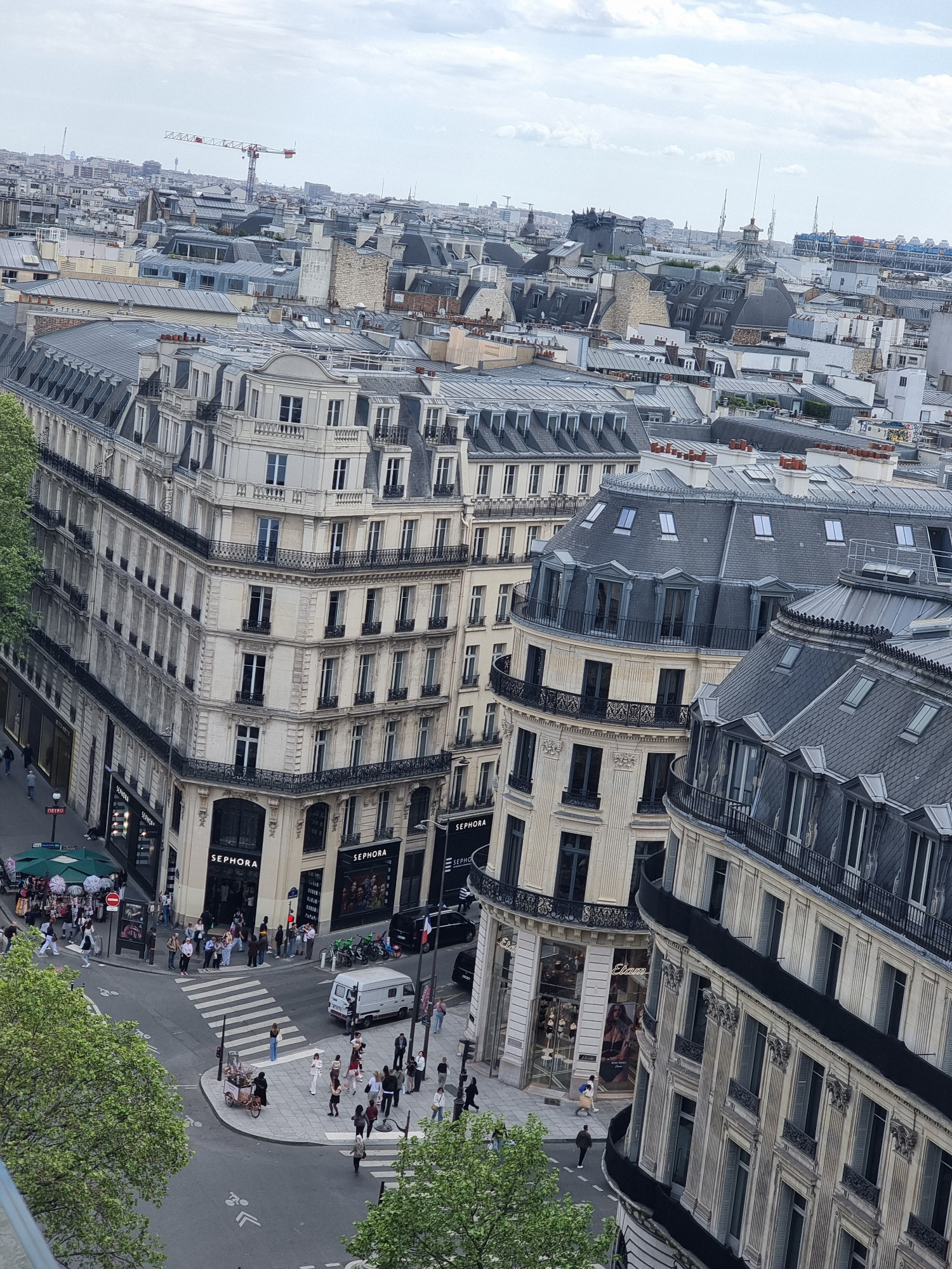 The image depicts an aerial view of a street in Paris, France. The street is lined with tall buildings of Parisian architecture, with ornate facades and multiple floors. The buildings house commercial…read more