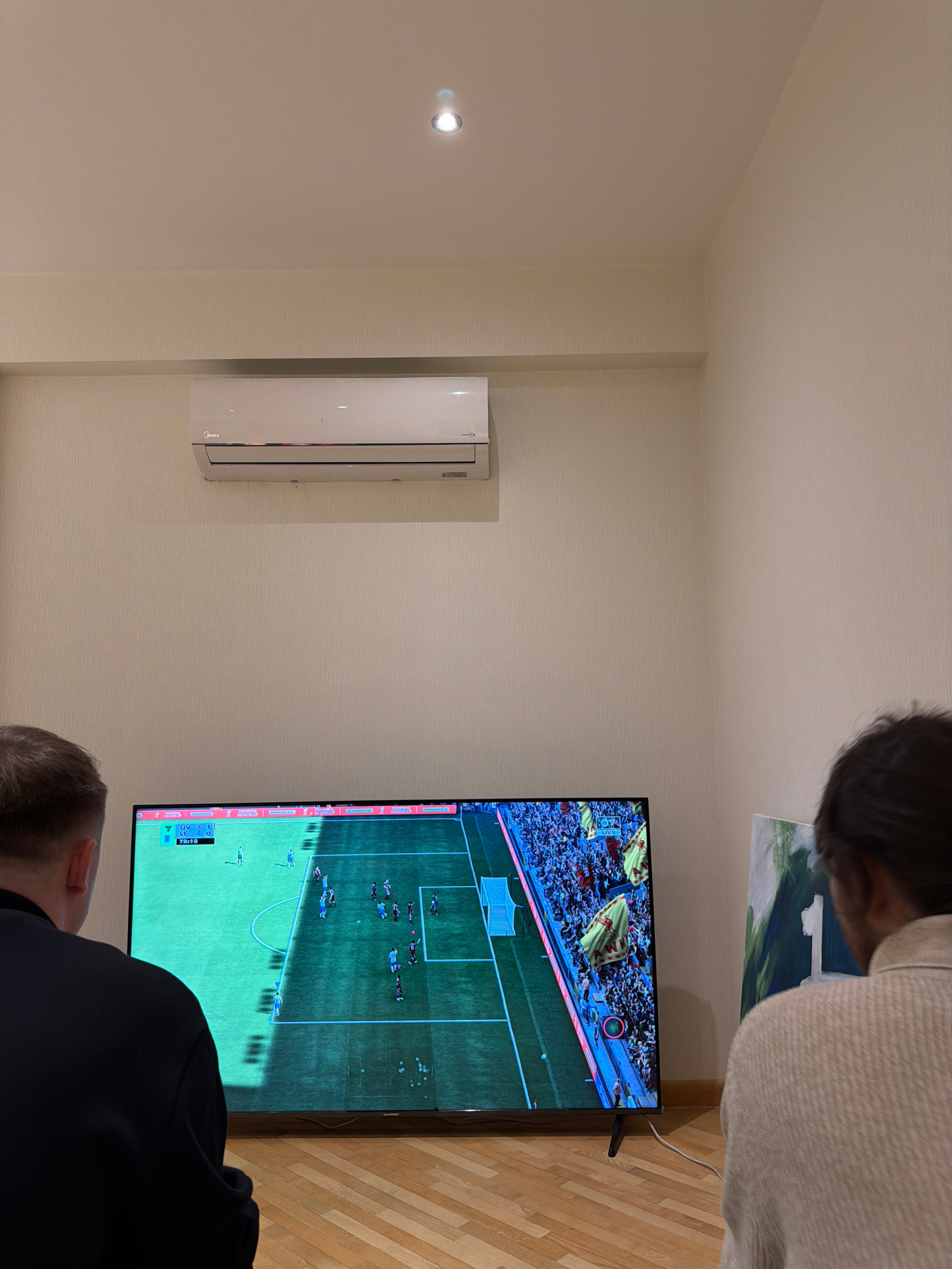The interior scene features a white wall on which a white air conditioning unit is mounted to the left of a television displaying a soccer match. Two people are partially visible, one at the top of thβ¦read more