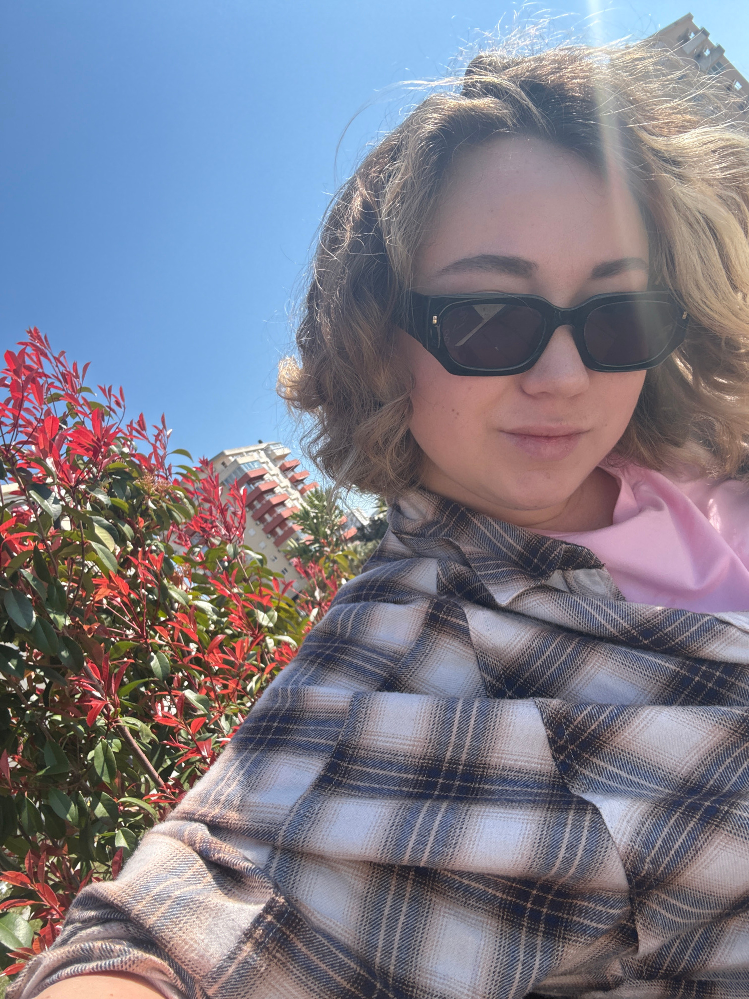 A selfie taken from a low angle shows a person with blonde, wavy hair wearing dark sunglasses, a pink hoodie, and a plaid shirt. The sky is clear and blue. In the background is foliage with red-tinged…read more