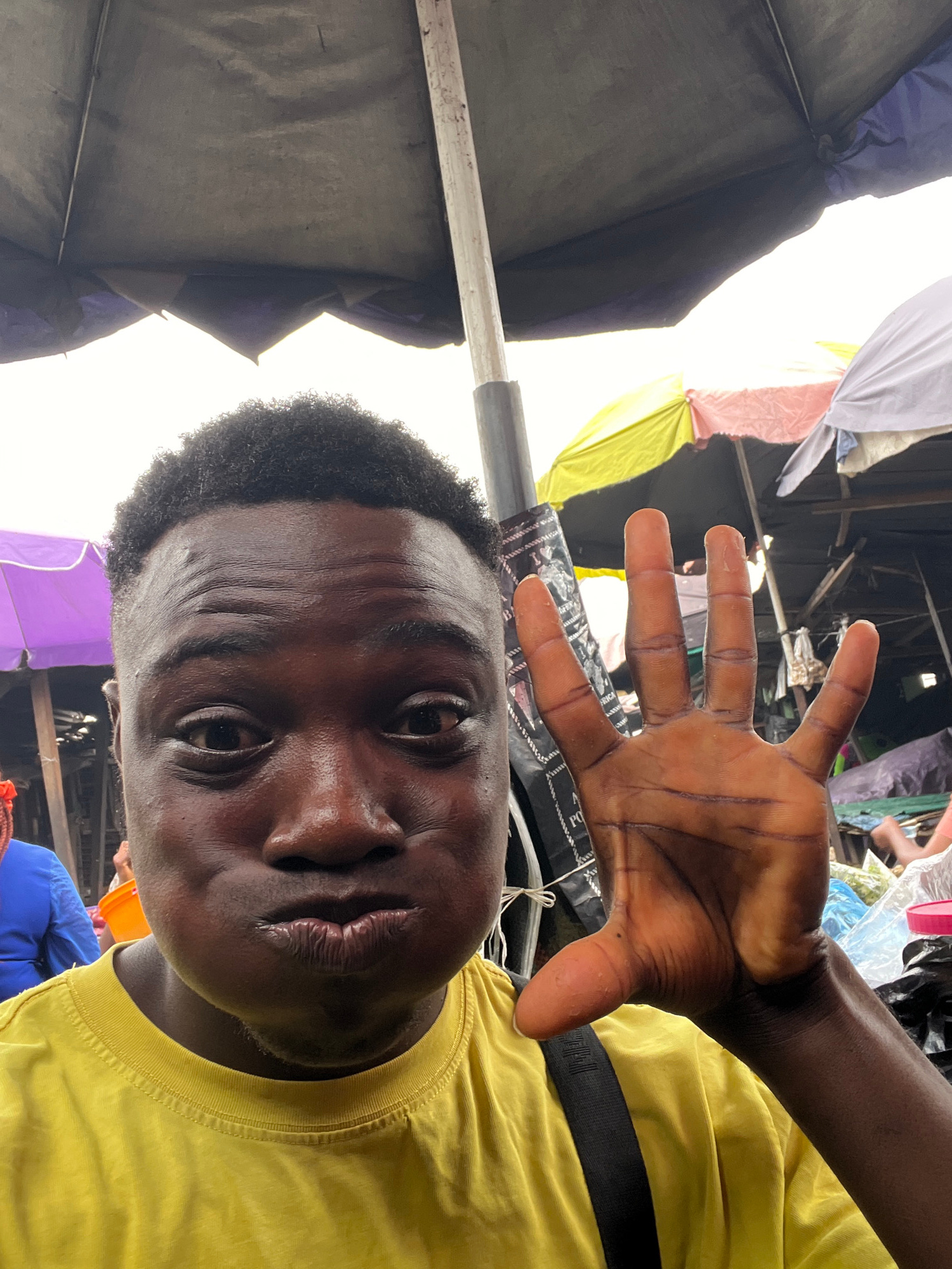 A medium-angle, close-up shot shows a Black male with short, curly hair, wearing a yellow t-shirt with a black strap across his chest, positioned slightly off-center. The male is holding up his hand i…read more