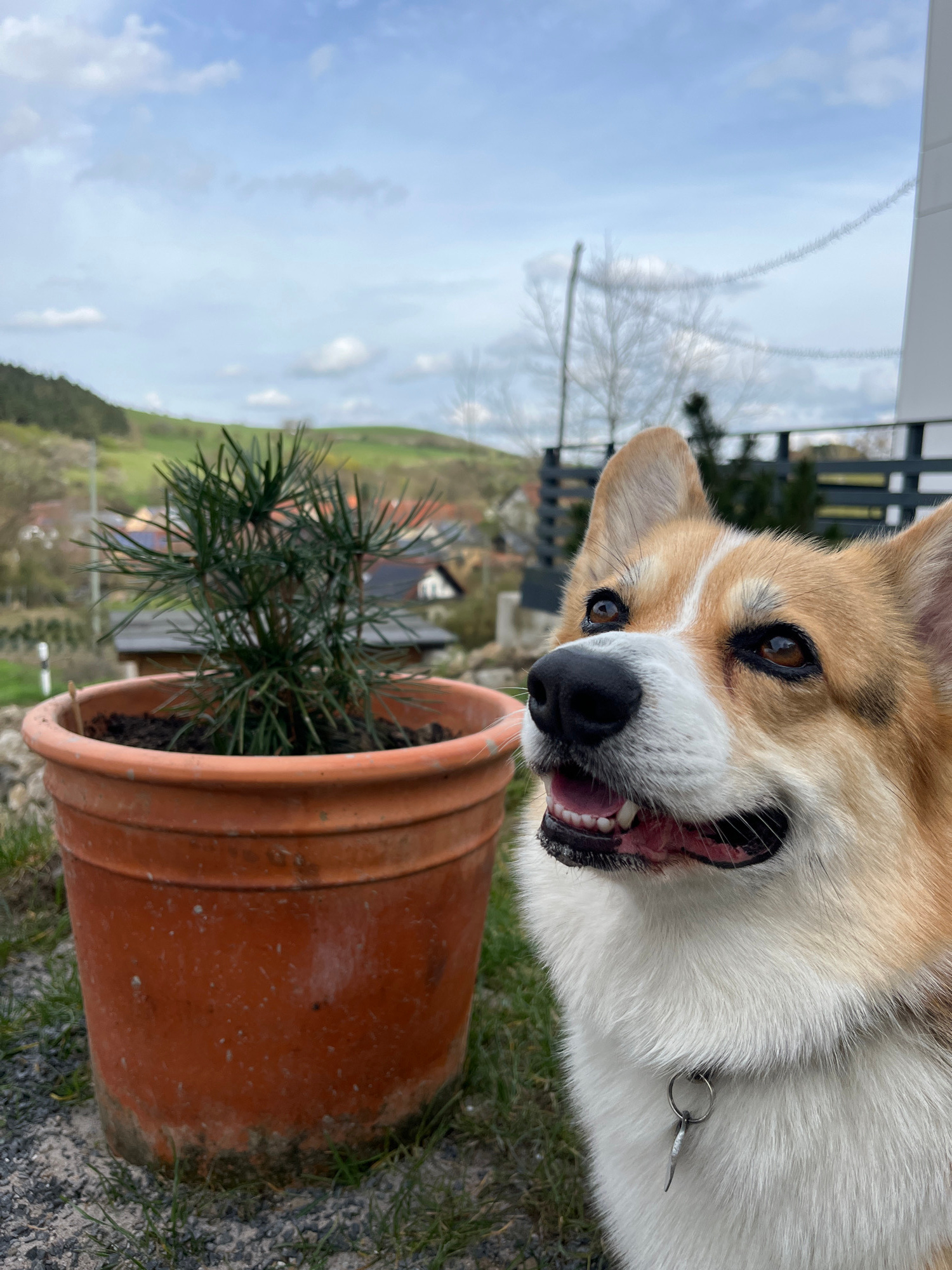 The image shows a close-up of a Pembroke Welsh Corgi dog looking directly at the camera, with its head tilted slightly. The dog has a tan and white coat, brown eyes, and its mouth is open as if it is…read more