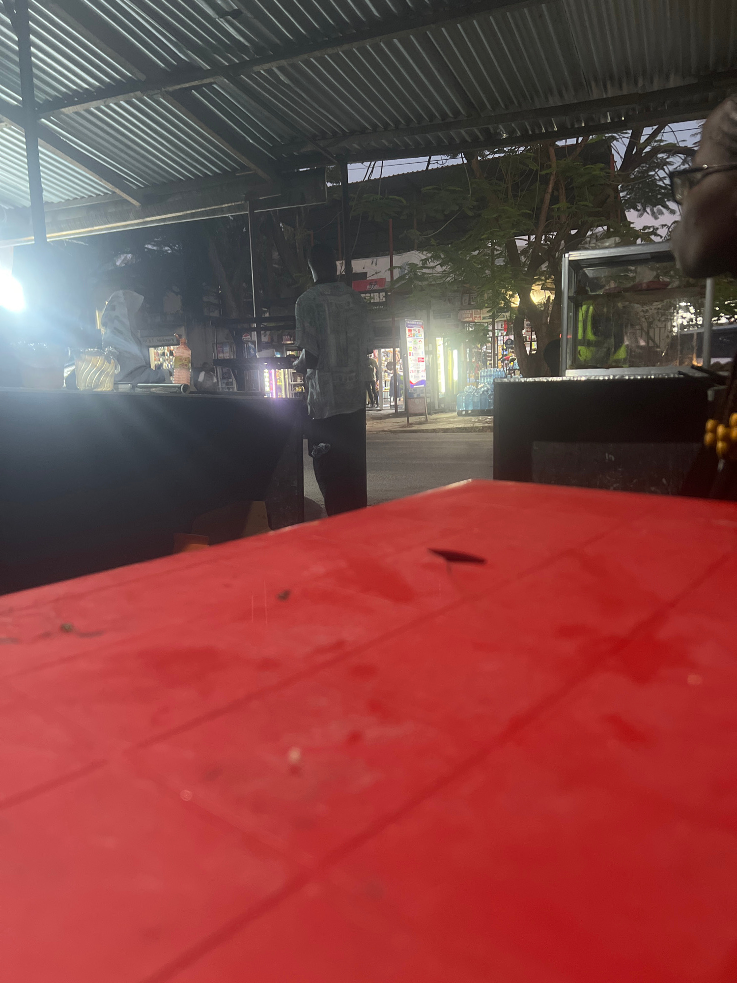 A tilted, close-up, nighttime street scene in Dar es-Salaam, Tanzania. Predominantly red, the image focuses on what appears to be a table or counter, taking up most of the right-hand side. Partially o…read more
