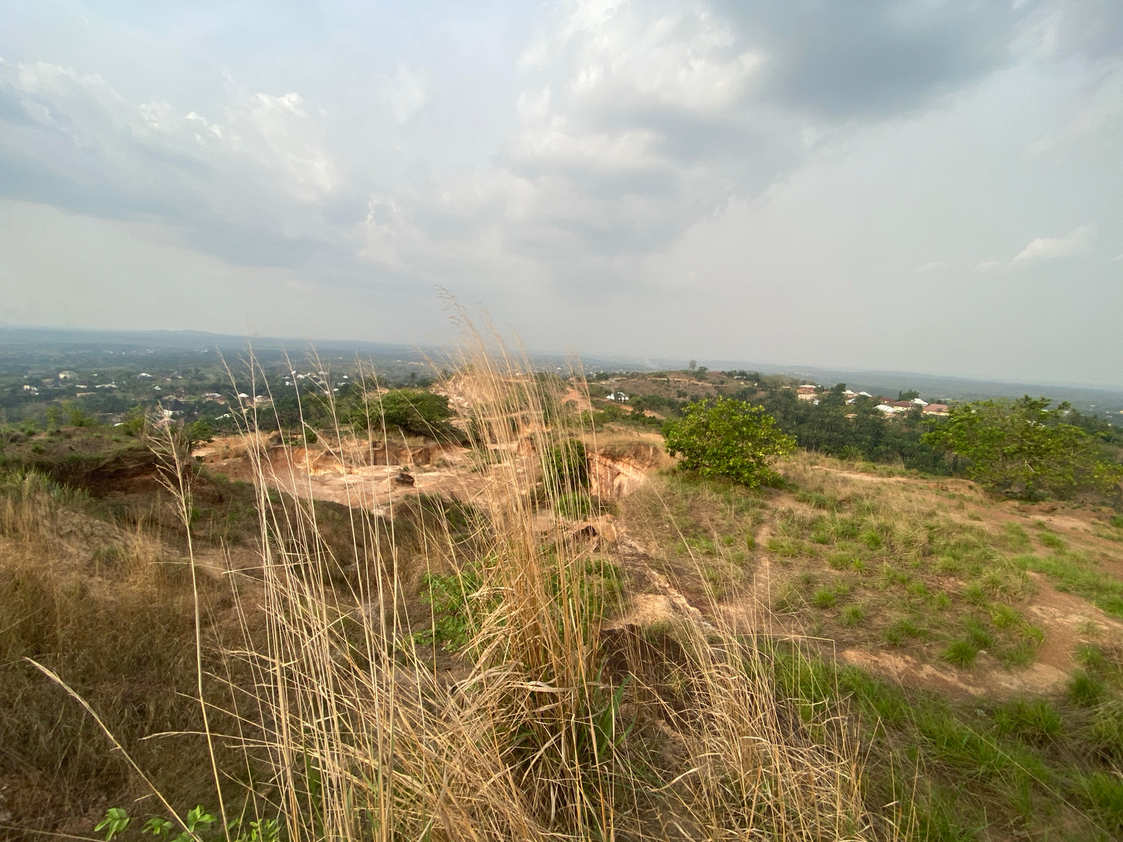 The image depicts a landscape in Achara, Nigeria, under an overcast sky. The foreground is dominated by tall, dry grass, obscuring some of the view. Behind the grass, there's an area of exposed earth,…read more