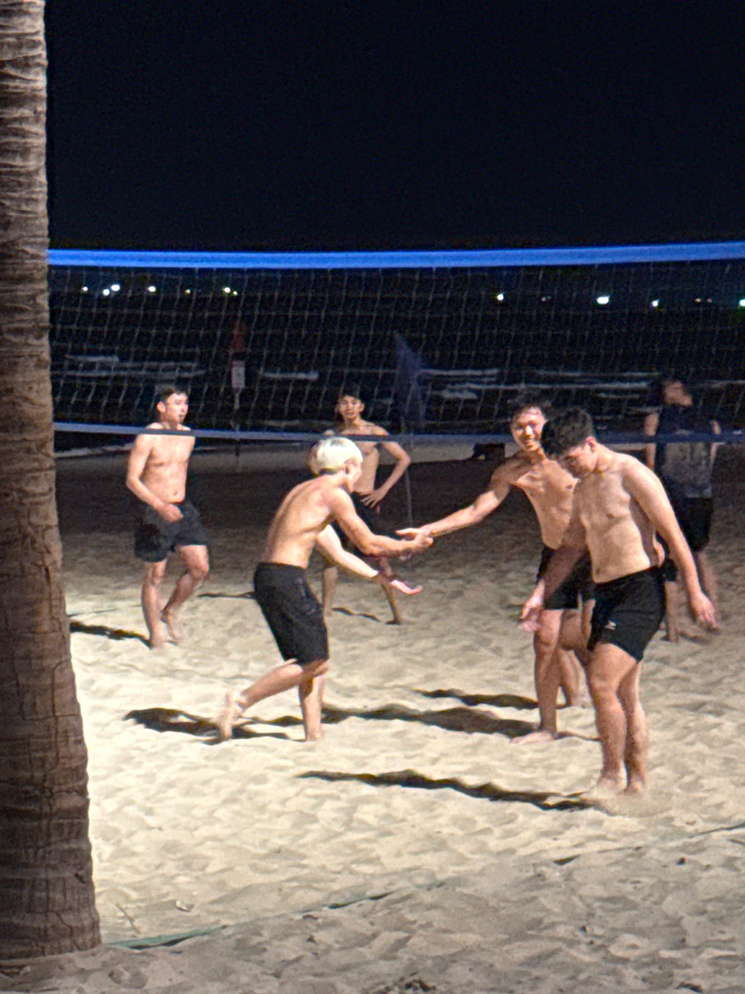The image depicts a beach volleyball game at night. Six shirtless men wearing shorts are playing on a sandy court, with a net visible on the left side of the frame against a dark sky. The foreground a…read more