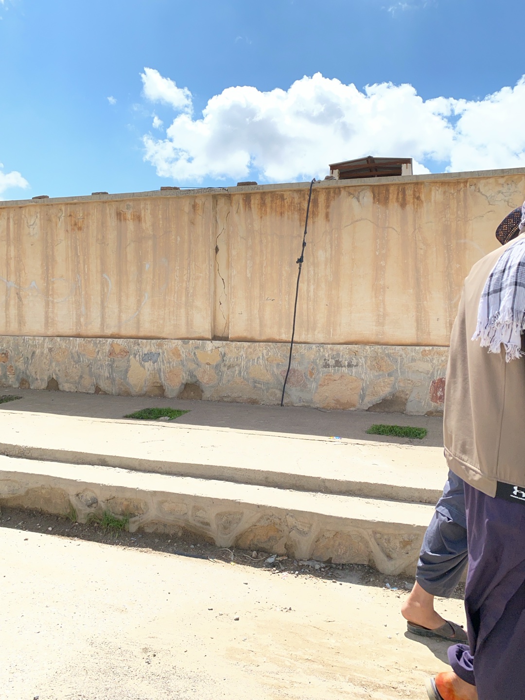 A daytime outdoor scene in Kandahar, Afghanistan, shows a tan-colored, weathered wall with a rough stone base under a bright blue sky with puffy white clouds. A black cable hangs down the wall. Concre…read more