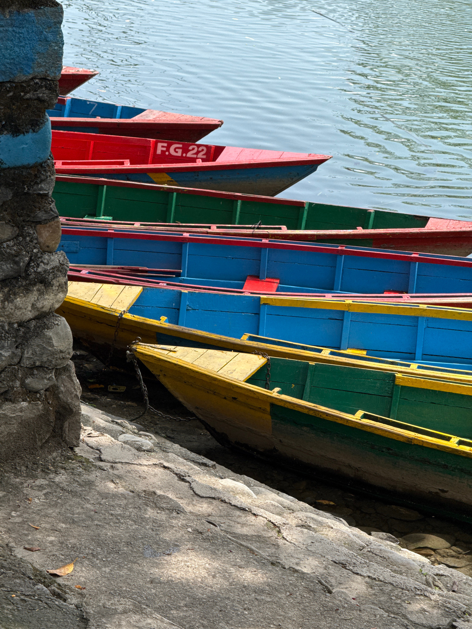 The image depicts a row of brightly painted traditional wooden boats partially beached along the shore of Phewa Lake in Pokhara, Nepal. Seven boats are visible in varying degrees, angled diagonally fr…read more