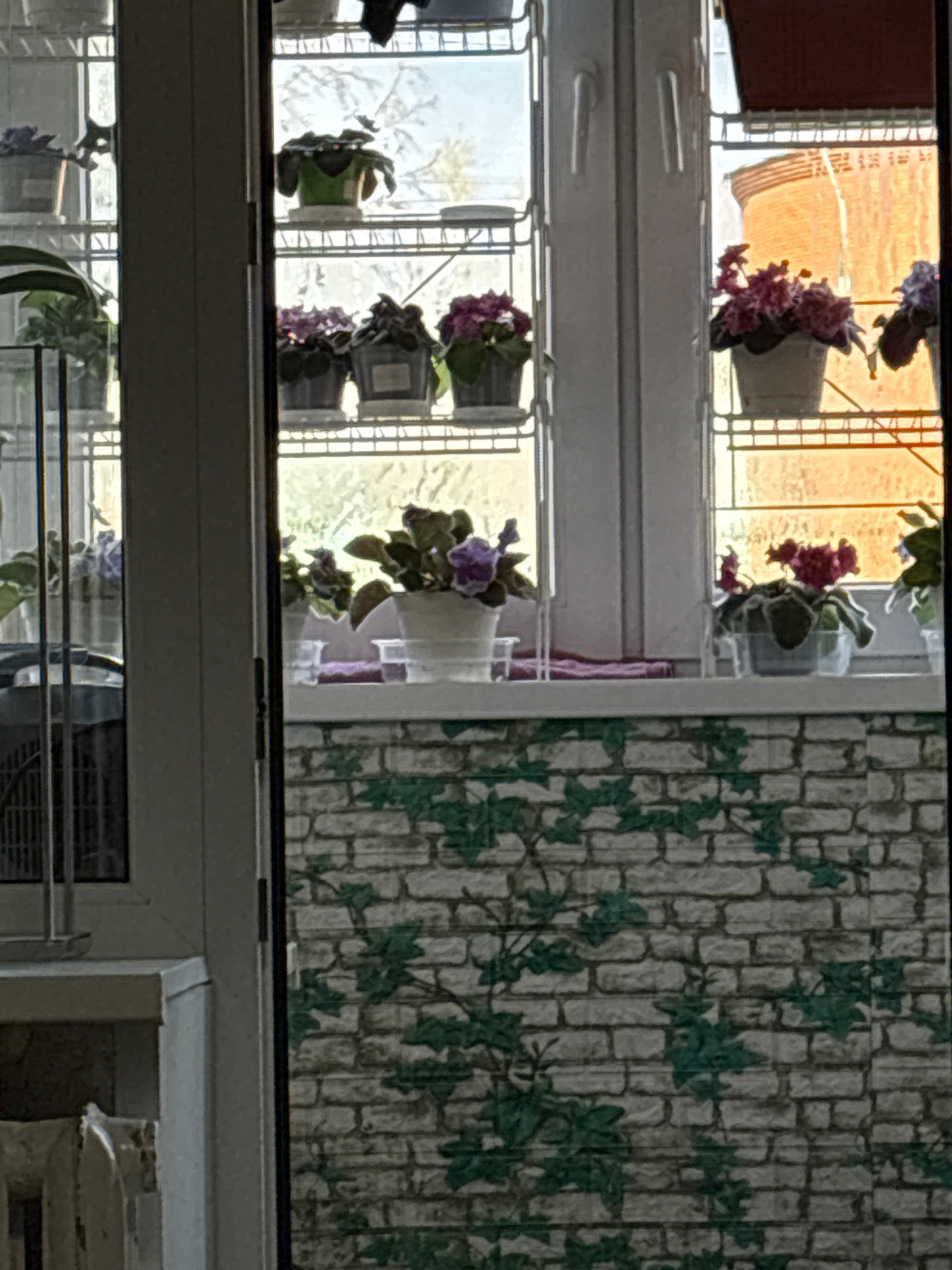 The image shows a window with multiple potted plants on shelves. Outside the window, there is a view of what appears to be another building, likely in an urban setting. Inside, the wall next to the wi…read more