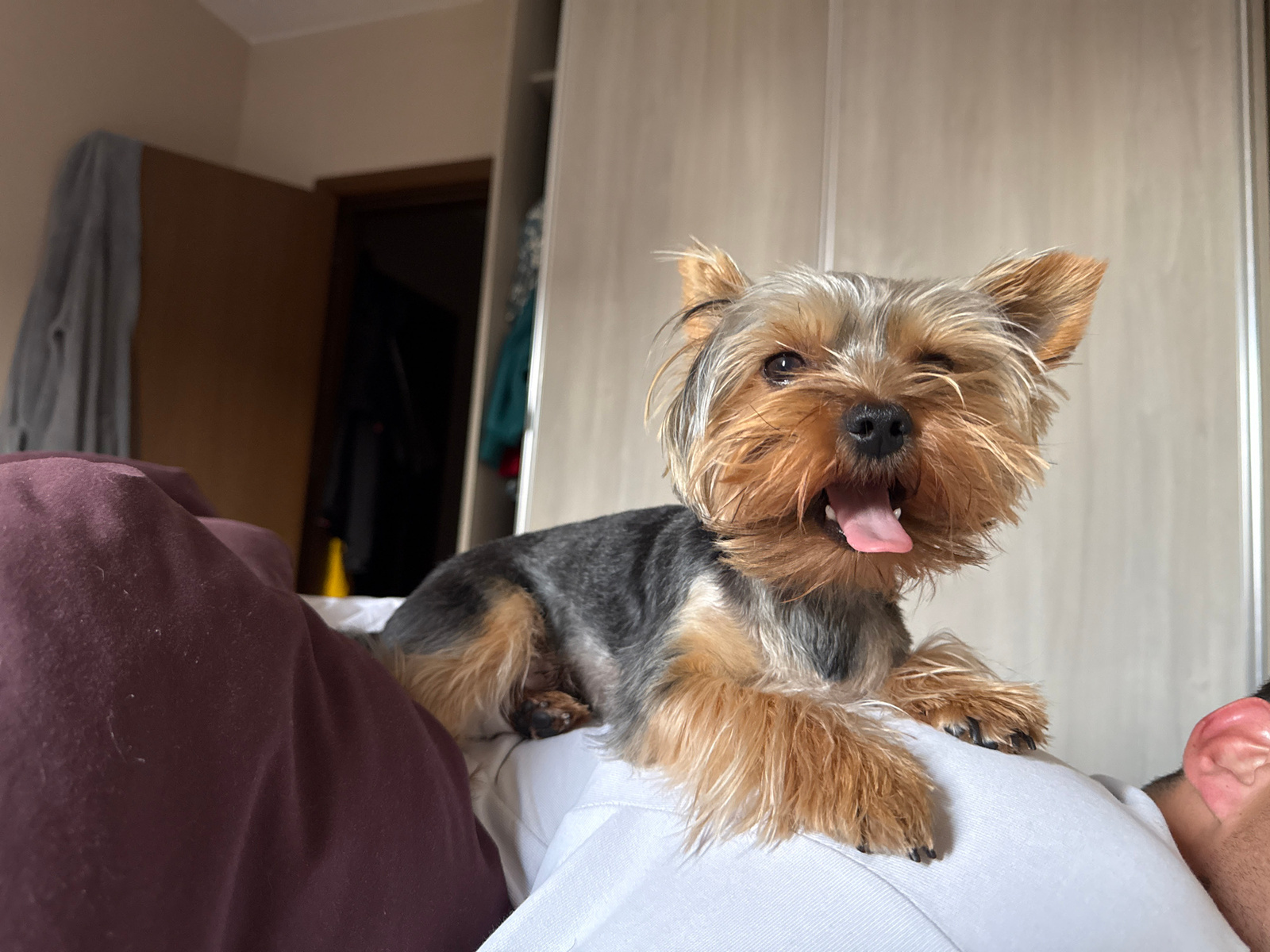 A small Yorkshire Terrier dog is held upside down by a person. The dog's tongue is sticking out. The person is wearing a white shirt. The background includes a wardrobe and a glimpse of a doorway reve…read more