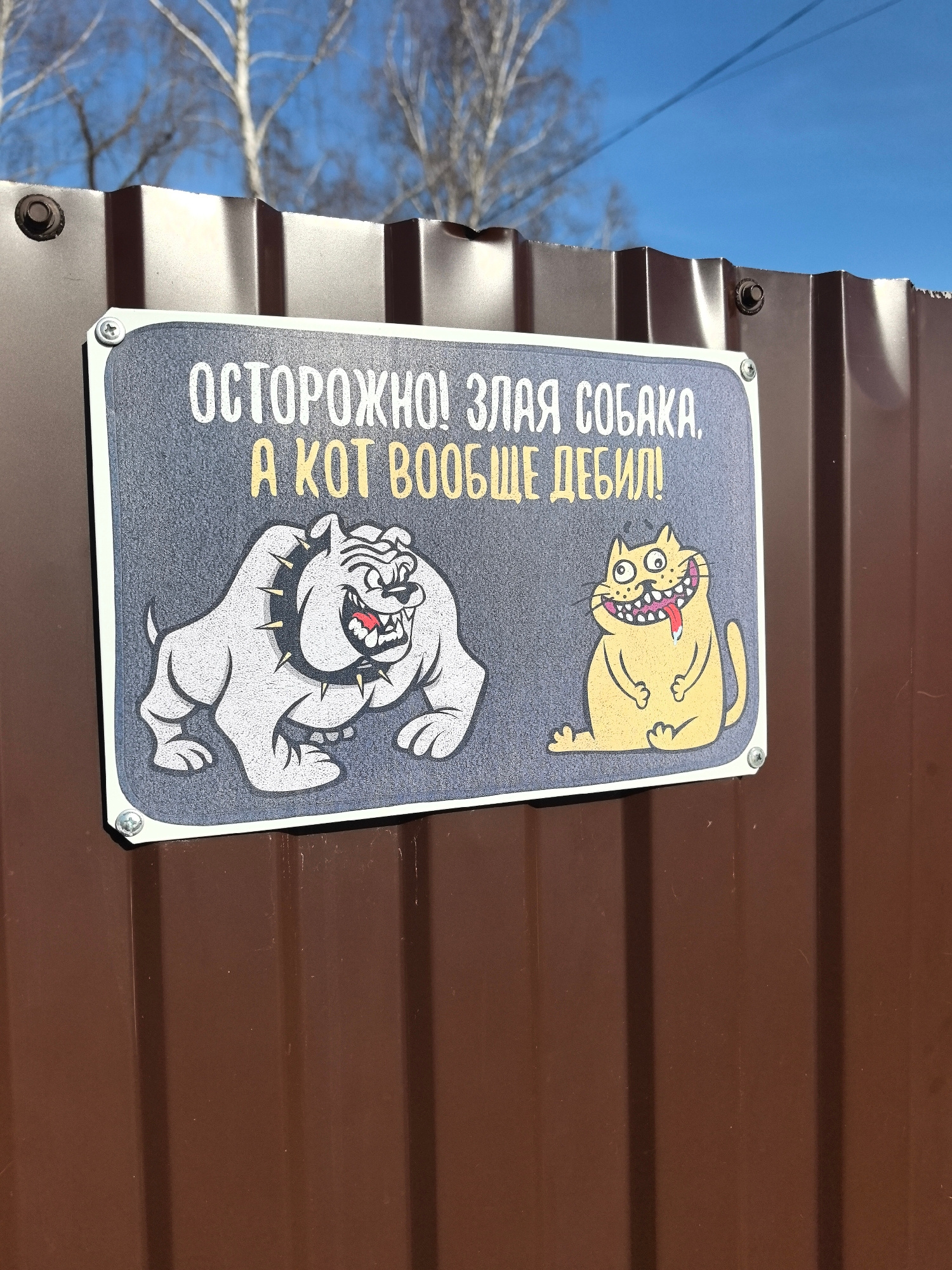 The image shows a warning sign attached to a brown metal fence. The sign features cartoon drawings of an angry dog and a cat, along with text in Russian: "ОСТОРОЖНО! ЗЛАЯ СОБАКА, А КОТ ВООБЩЕ ДЕБИЛ!",…read more