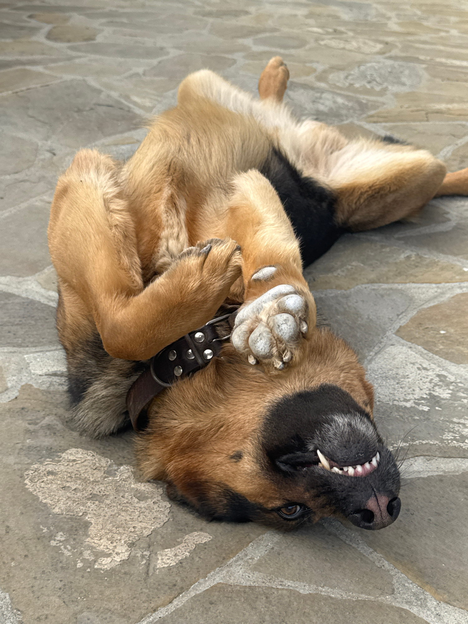 A medium-sized German Shepherd dog lies on its back on a flagstone surface. The dog has a black and tan coat, with a black muzzle and a brown collar. Its paws are curled up near its chest and its teet…read more