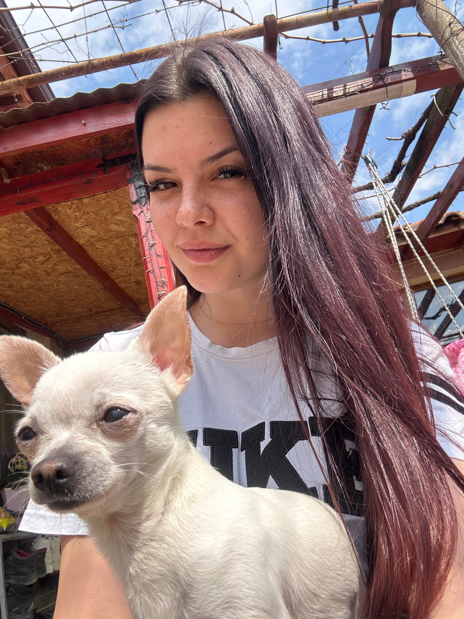 A woman with long, dark auburn hair is holding a small, white dog. The woman is wearing a white t-shirt with black print. They appear to be outside, under a structure with wooden beams and a metal roo…read more