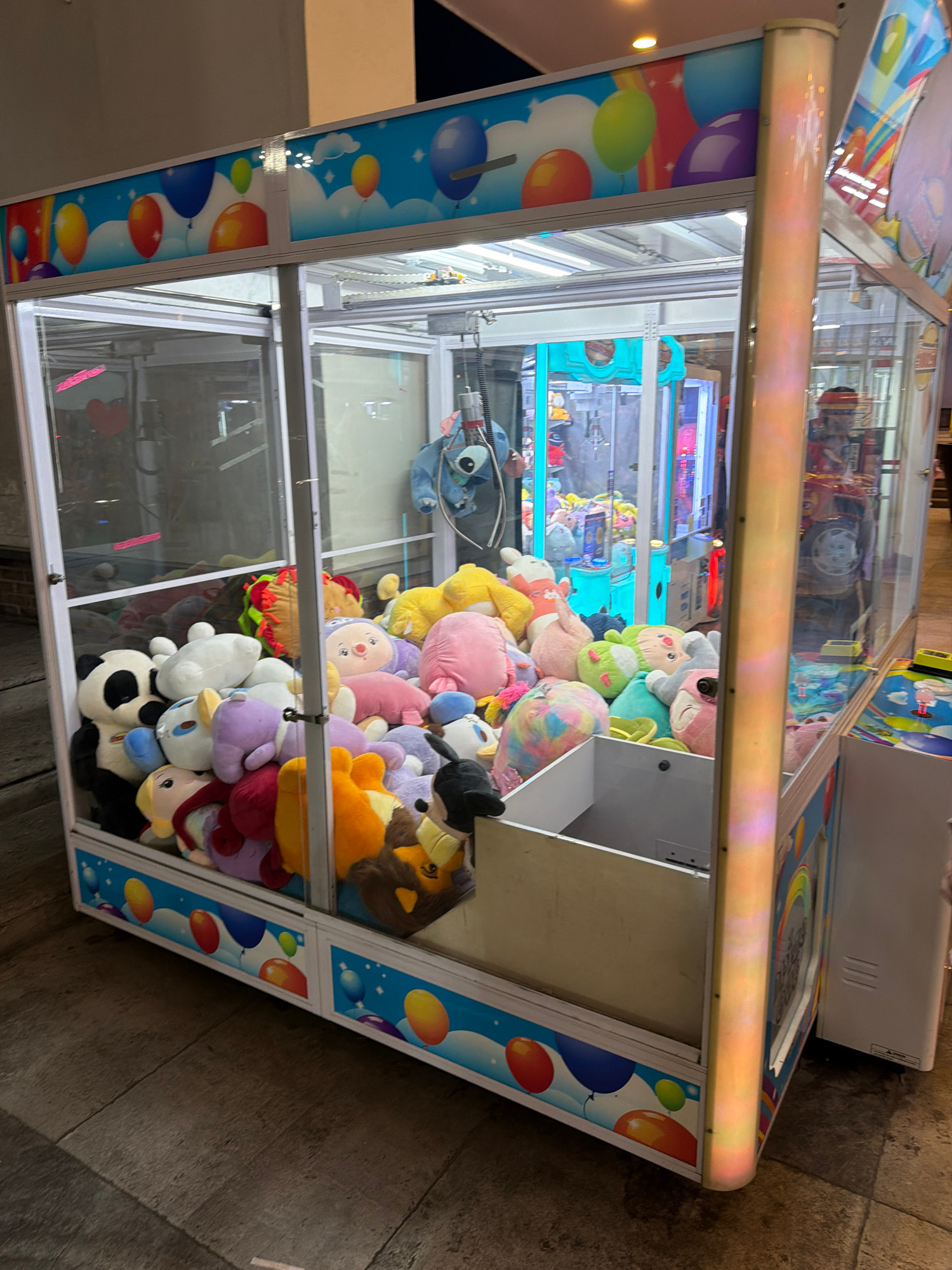 The image shows a claw machine arcade game filled with plush toys, predominantly oriented on a right-to-left axis. The machine has a white frame adorned with balloon designs on a blue background. The…read more