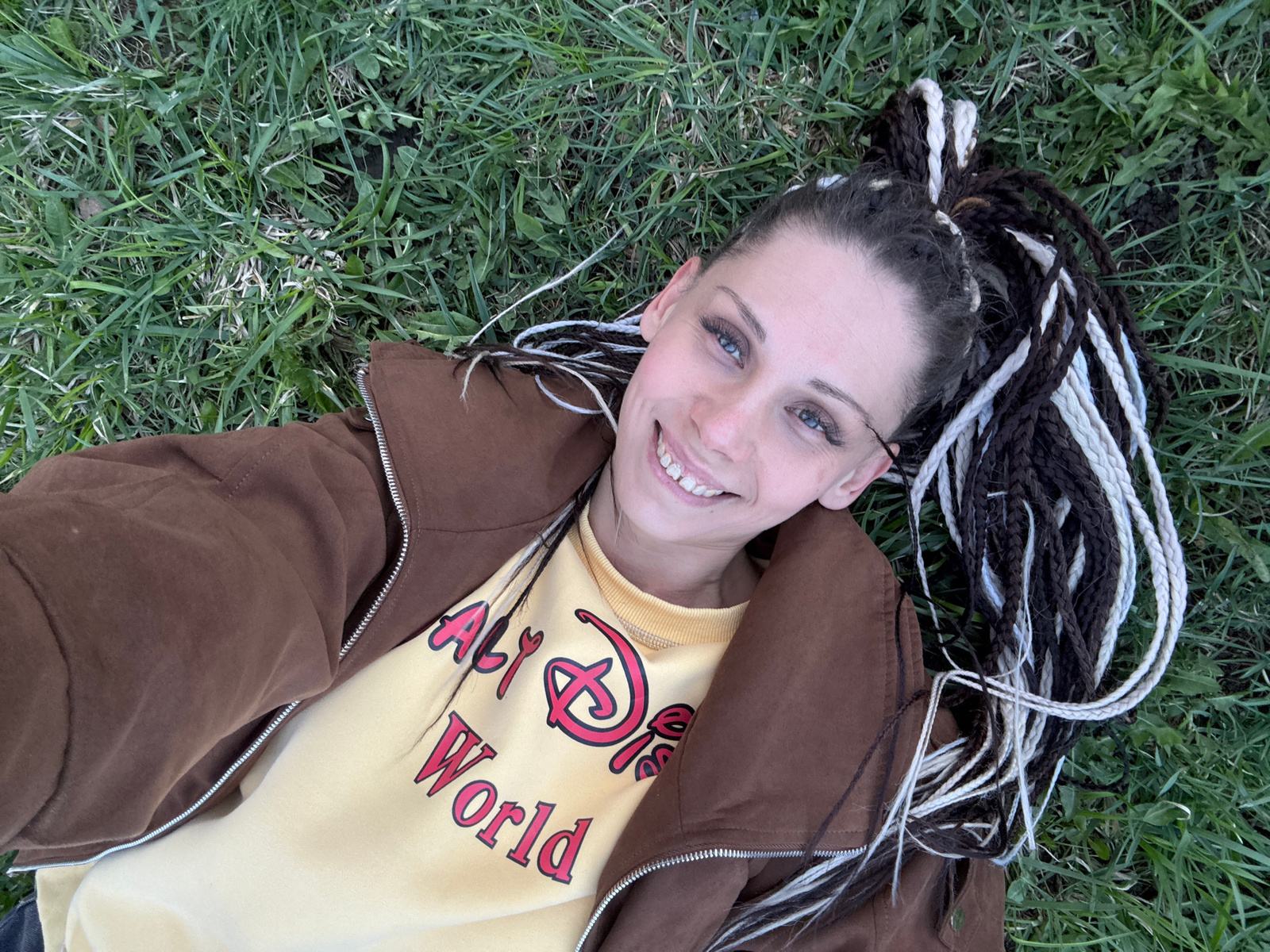 A fair-skinned person is lying on their back in a grassy area. They are wearing a yellow sweatshirt with red lettering, partially obscured by an unzipped brown jacket. The person has dark and light-co…read more