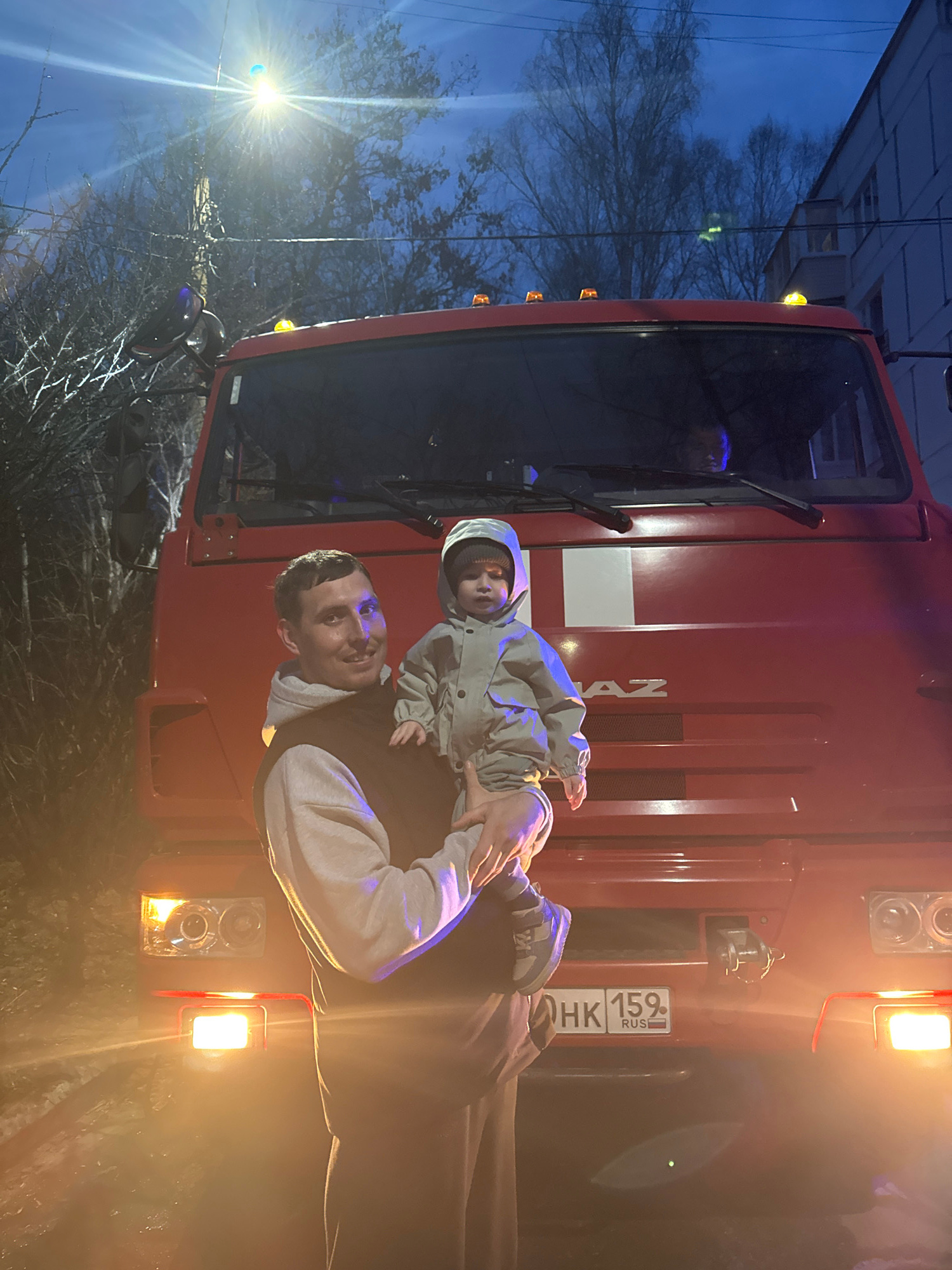A man stands next to the front of a red truck, holding a baby. The truck has a license plate that reads "HK 159 RUS." The scene appears to be at dusk or night, indicated by the lighting. The location…read more