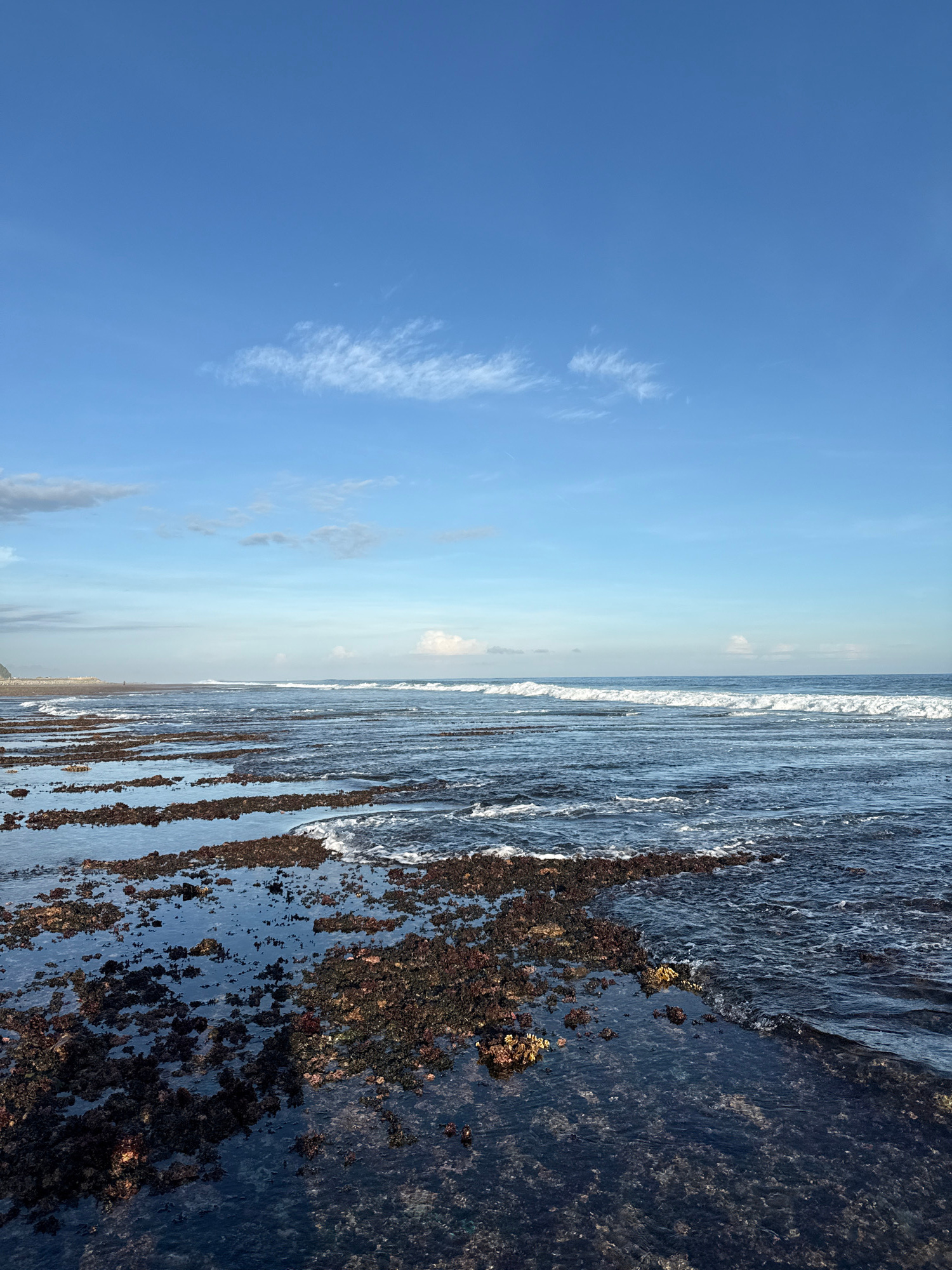 The image depicts a serene coastal landscape, likely in Kuta Selatan, Indonesia, under a clear, bright blue sky. The scene is dominated by the expanse of the ocean meeting a rocky shoreline. The uppe…read more