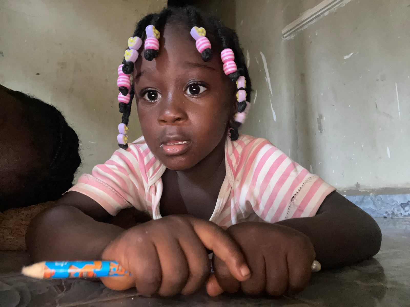 A young child, likely a girl with dark skin, is depicted in a head-and-shoulders portrait, looking directly at the camera with wide, dark eyes. She is holding a colorful blue and orange patterned penc…read more