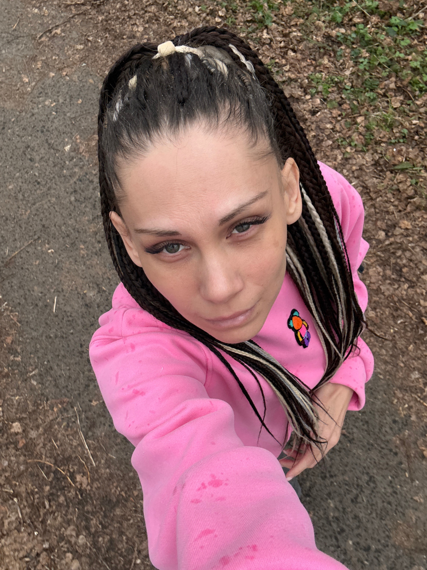 A woman with braided black and white hair is seen from a high-angle perspective. She is wearing a pink sweatshirt with a colorful butterfly patch. The background consists of dirt and leaves, possibly…read more
