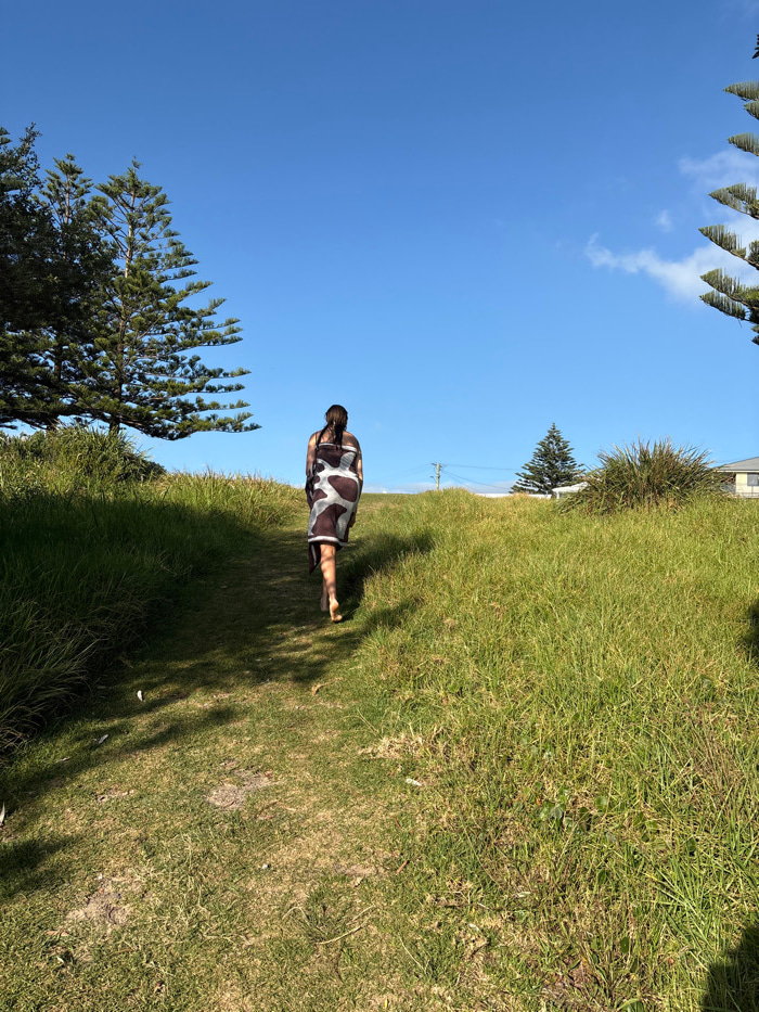 A woman in a brown and white patterned dress walks barefoot on a grassy field under a blue sky. Trees and bushes frame the scene, some casting shadows on the grass. A building can be seen in the dista…read more
