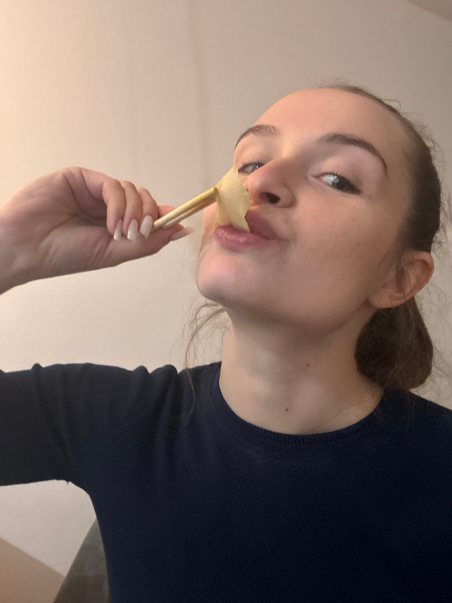 A young woman with fair skin and light brown hair pulled back in a ponytail is holding a pale yellow flower or object with a stem, close to her mouth. She is wearing a dark blue long-sleeved shirt. He…read more
