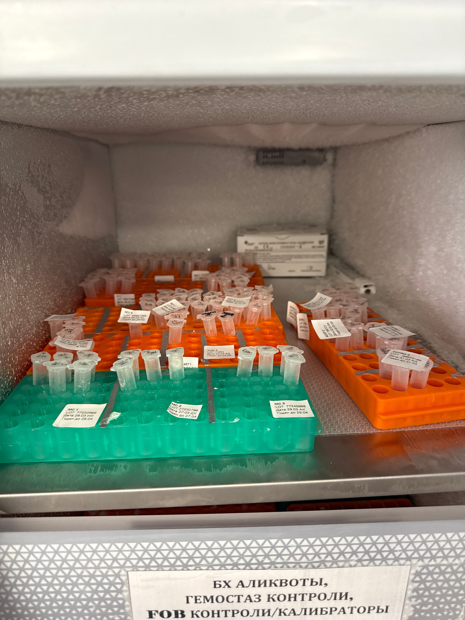 The image shows a freezer compartment containing rows of small tubes held in orange and green racks. Each tube has a label affixed to it, some of which are partially visible. The labels contain text,…read more