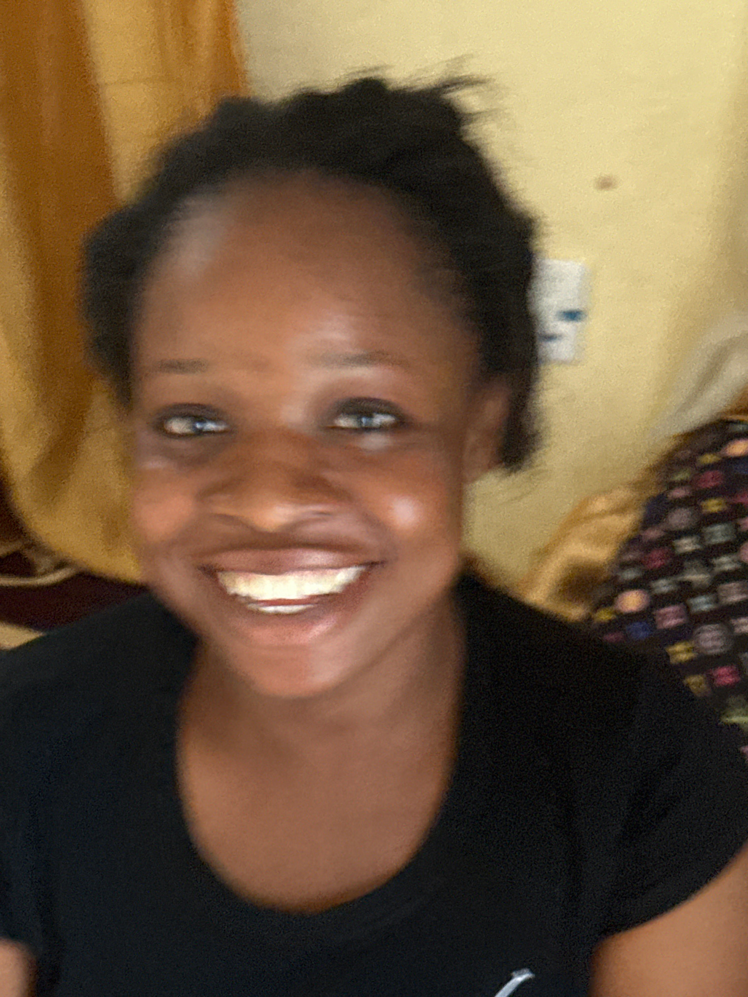 A slightly blurry portrait photograph, oriented horizontally, depicts a young woman smiling broadly at the camera. She has dark skin and short, dark, natural hair styled upwards. Her dark eyes are ope…read more