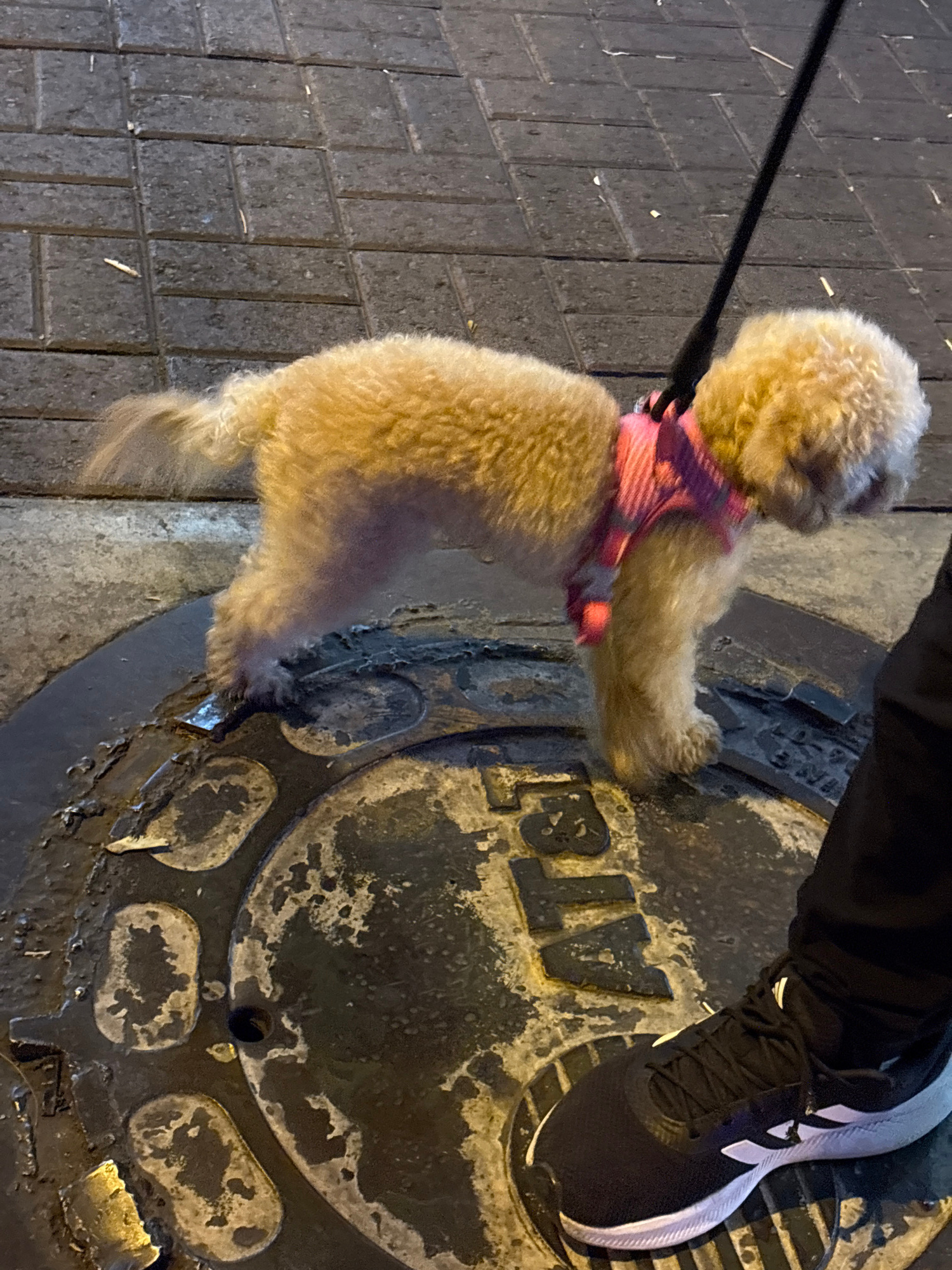 A tan poodle wearing a pink harness stands on a dark manhole cover with the word "ATLV" inscribed on it. A black leash is attached to the dog's harness. A person's leg wearing black pants and a black…read more