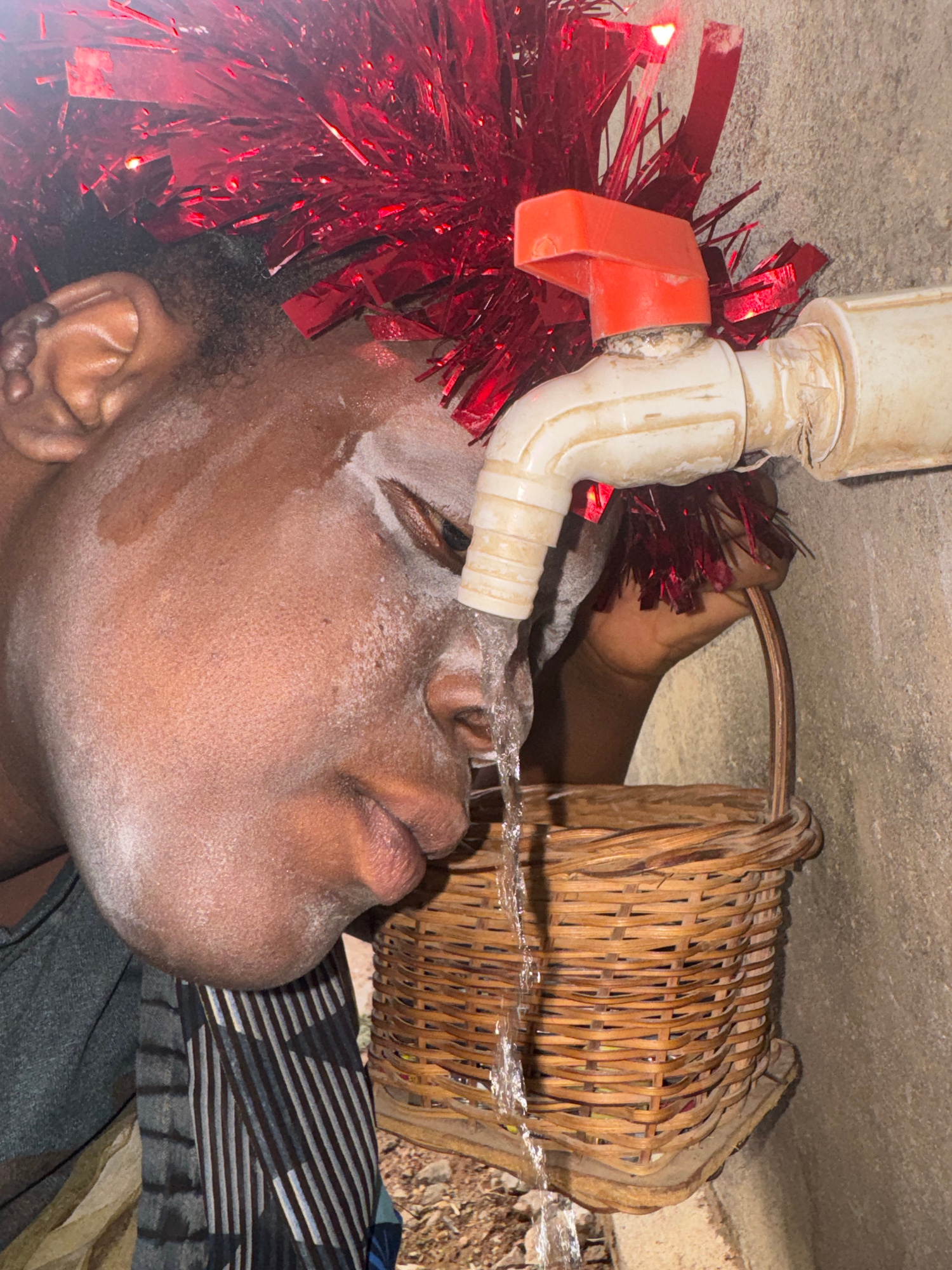 A close-up, low-angle shot shows a person lying on their back with their head positioned under a water pipe. The person appears to be Black and has white powder smeared on their face. Water is flowingβ¦read more