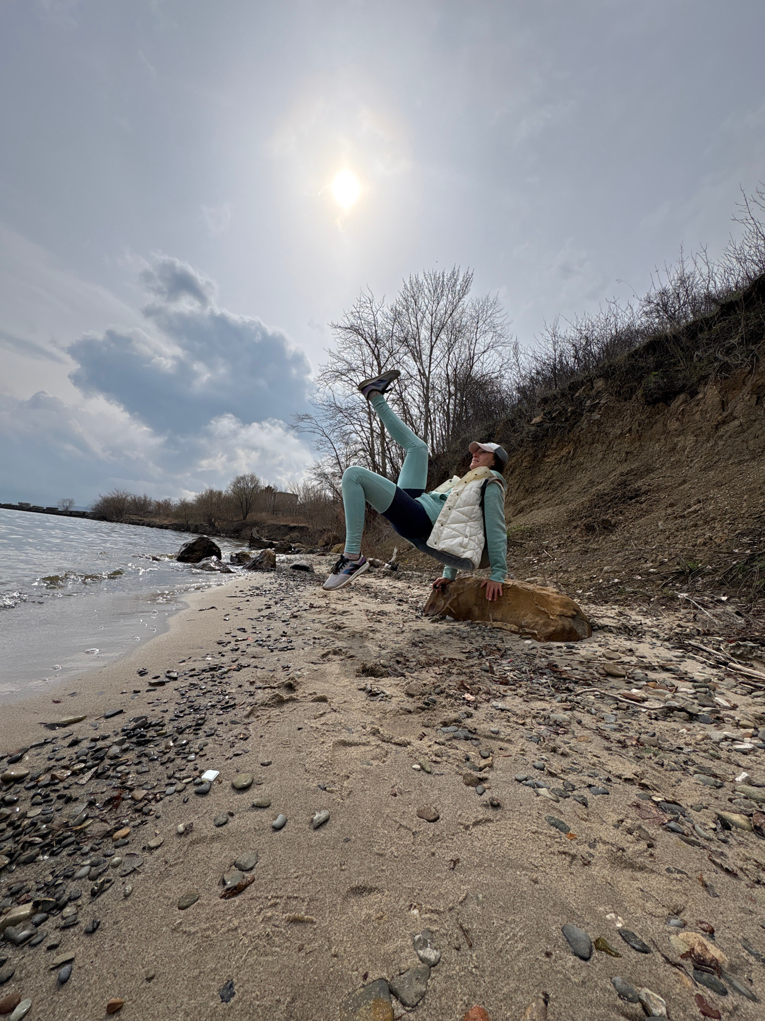 The image depicts a person mid-leap on a beach near water, presumably the Volga River, in Ulyanovsk, Russia, given its location. The subject is wearing athletic attire including leggings, a vest, andβ¦read more