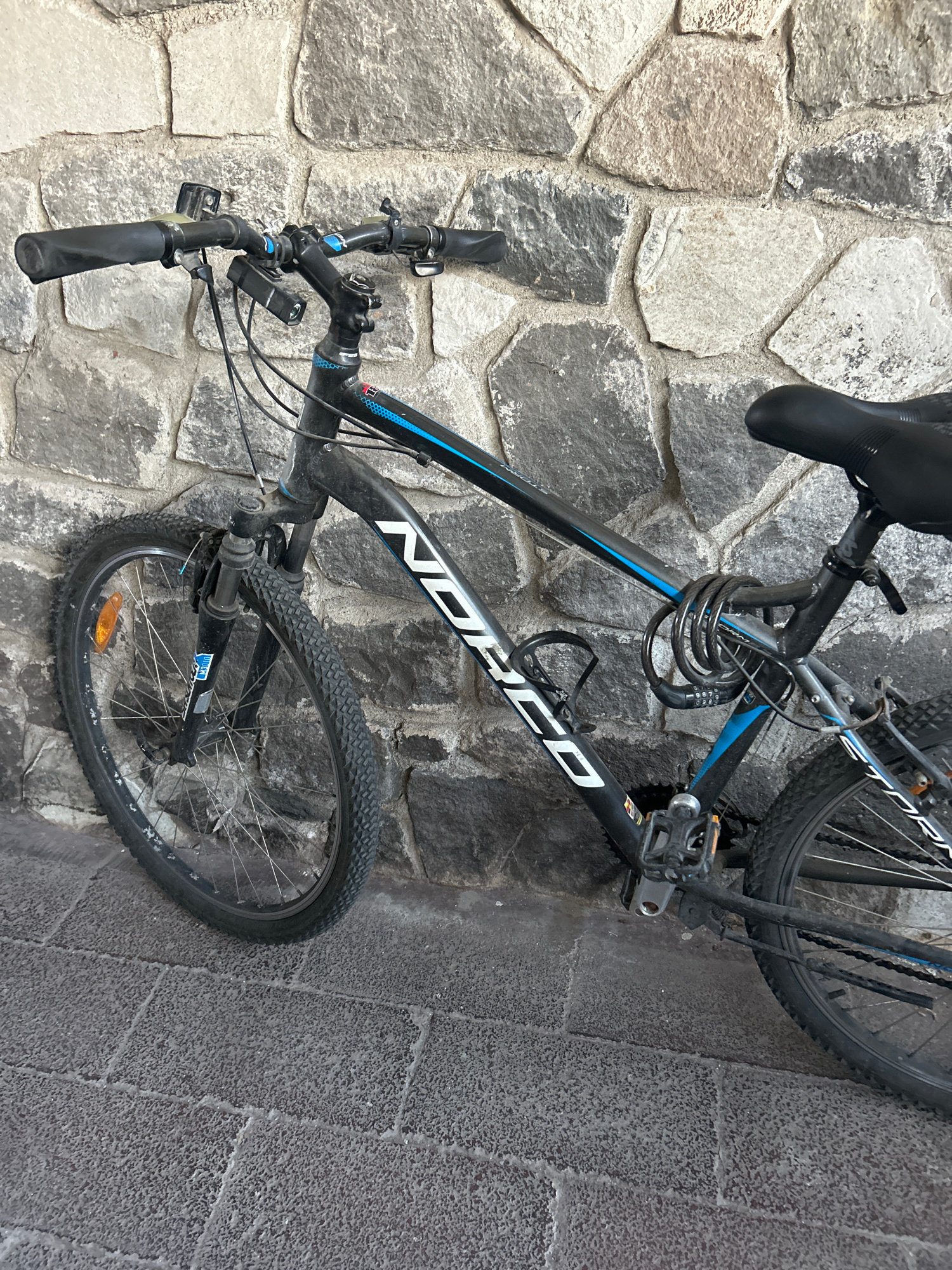 A black and gray Norco Storm bicycle is leaning against a stone wall in an unidentified city. The bicycle is locked with a coiled cable lock. The wall is constructed from irregularly shaped gray stone…read more