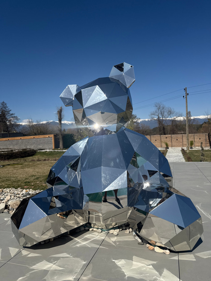 The image presents a large, polygonal sculpture of a seated teddy bear, constructed from numerous highly polished, reflective silver-colored metal facets. The sculpture is positioned outdoors on a gre…read more