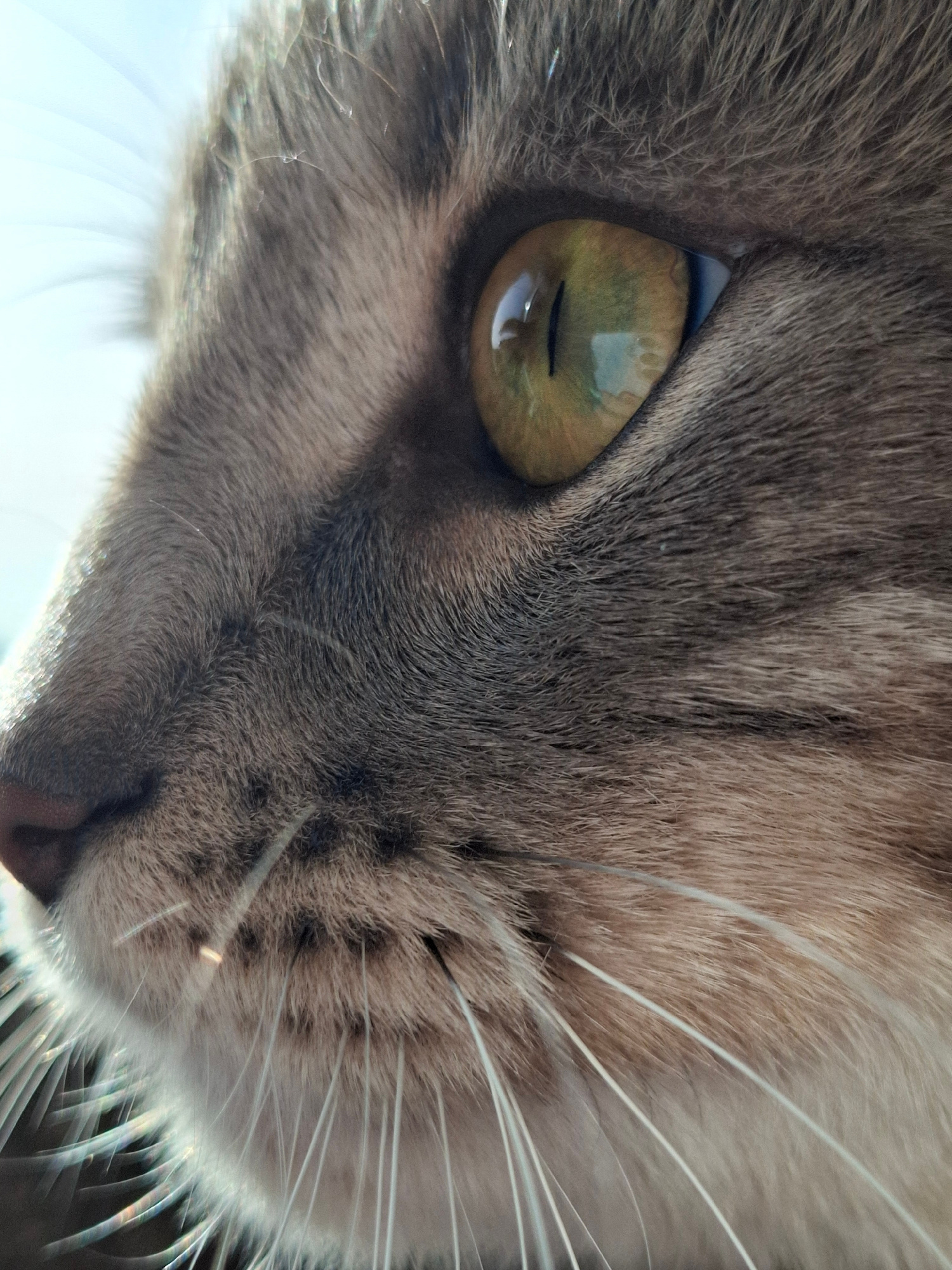 A close-up, low-angle shot shows the face of a cat. The cat has gray and brown fur with long, white whiskers. Its eye is yellow-green with a vertical black pupil. The cat's pink nose is partially visi…read more