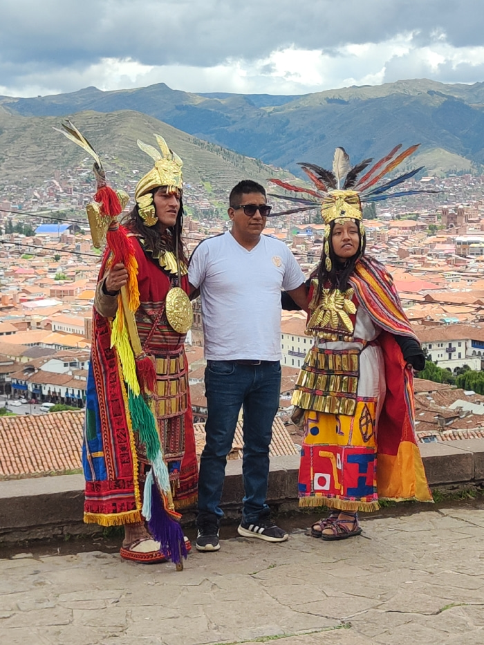 Three people stand on a stone platform overlooking a city with red tile roofs. Two are adorned in elaborate, colorful Inca costumes featuring feathered headdresses and gold breastplates. The central f…read more