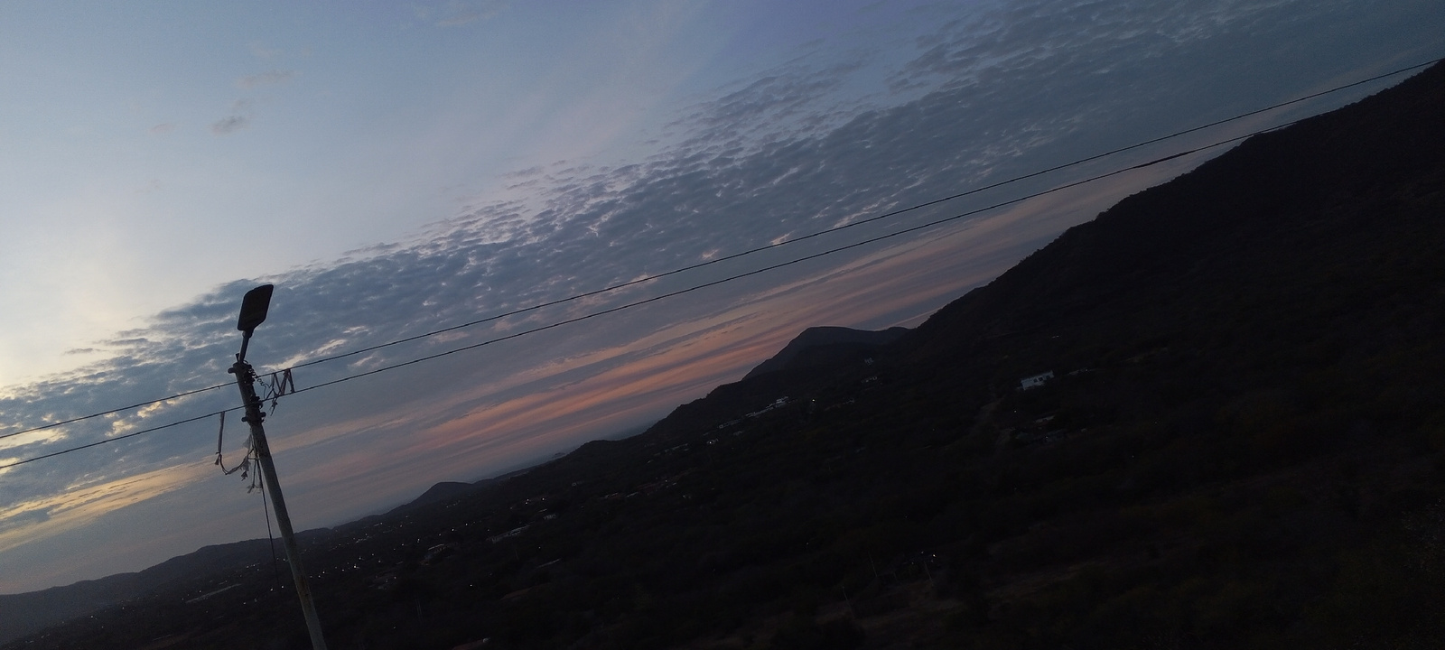 The image presents a twilight scene, likely at dusk, with a view encompassing both the sky and a mountainous landscape. The sky is characterized by layered cloud formations, with a band of orange andβ¦read more