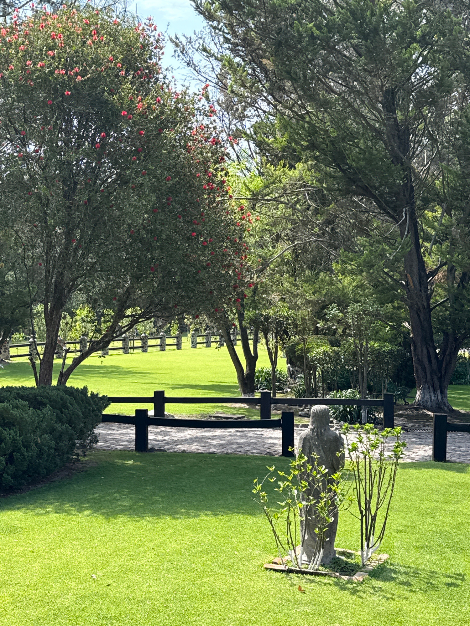 The image shows a garden or park setting in Cañada de Madero, Mexico. A black fence runs along a gravel path, separating a manicured lawn from various trees and plants. A tree with red flowers is prom…read more