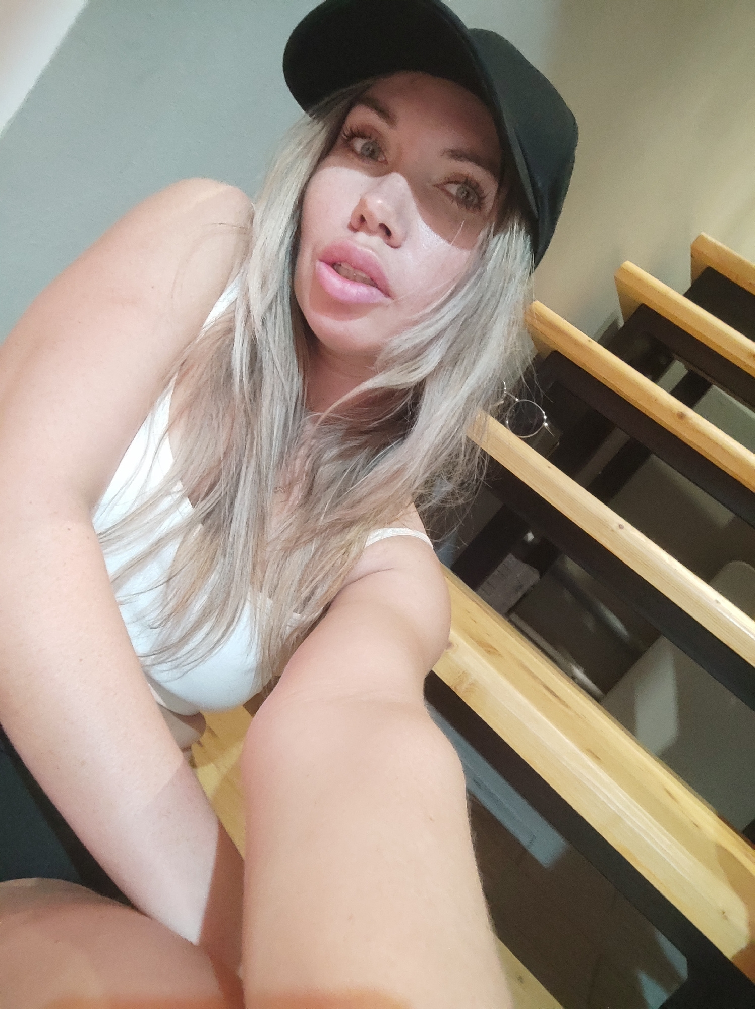 A woman wearing a black baseball cap and white tank top sits on wooden stairs. The location is unidentifiable as Votkinsk, Russia.