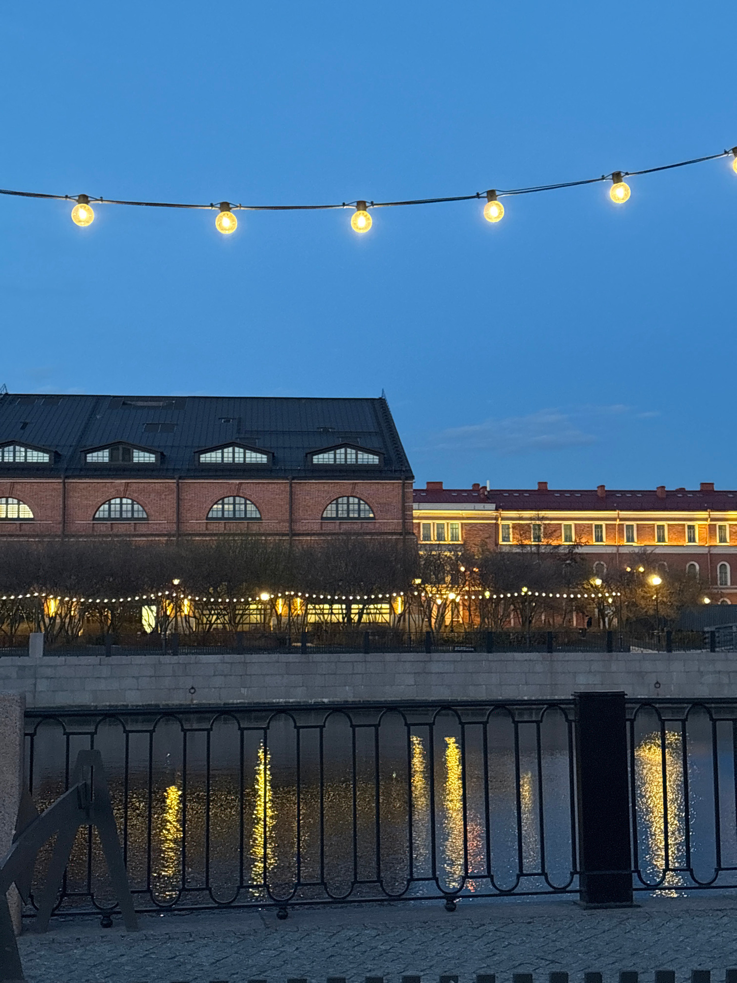 The image depicts an urban scene, likely taken during dusk or early evening, in Saint Petersburg, Russia. A strand of round, incandescent light bulbs hangs diagonally across the left side of the frameβ¦read more