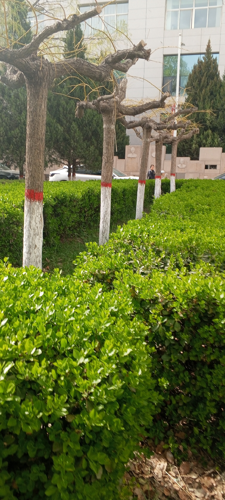 The image depicts a row of trees with whitewashed trunks and red bands near the top of the whitewash. The trees are situated behind a dense green hedge. Behind the trees and hedge, there is a low ston…read more