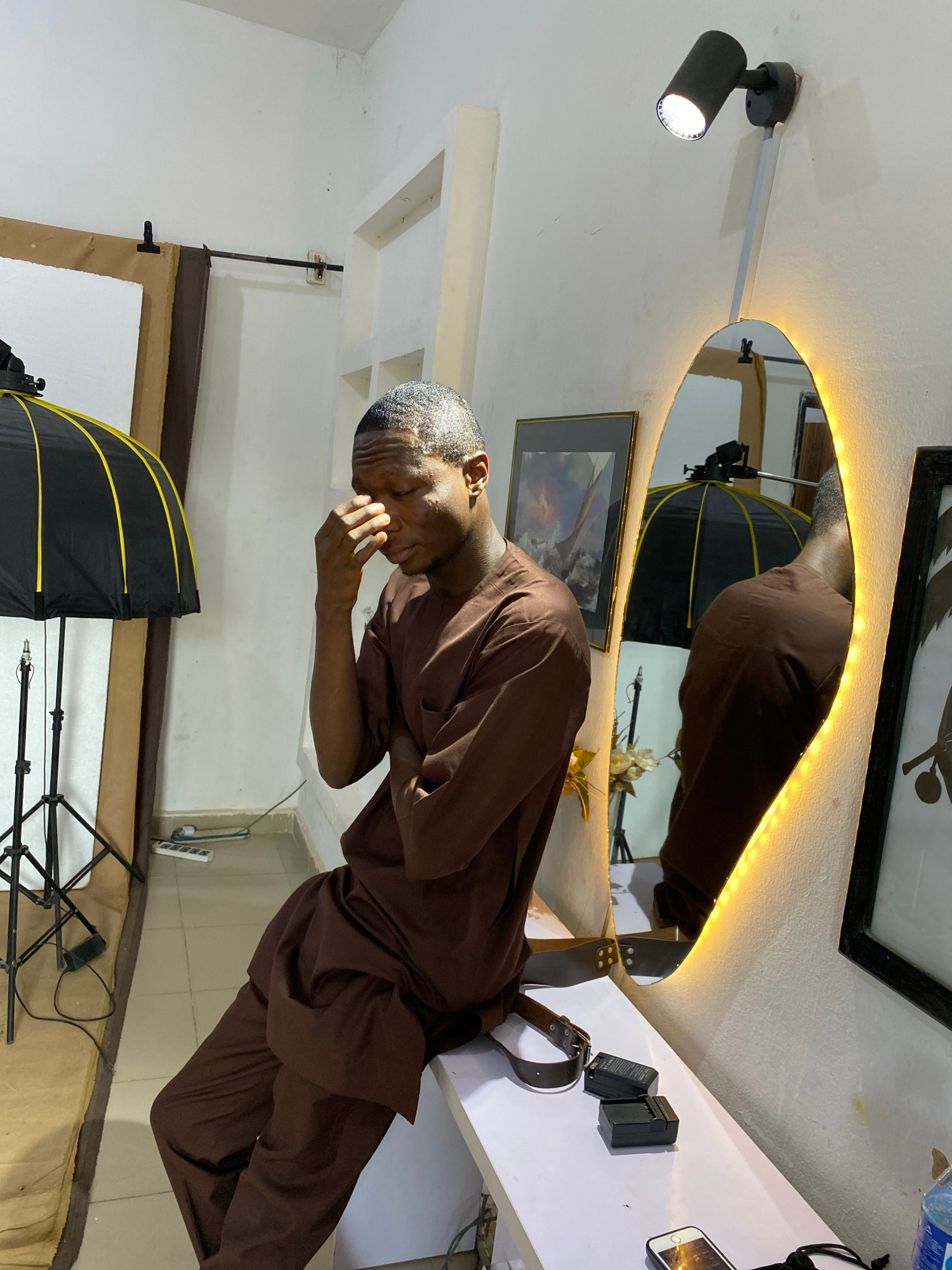 A man in a brown tunic and trousers stands inside a room, seemingly touching his forehead with his right hand. Behind him is a circular mirror with LED lights, reflecting a similar scene. To the left…read more