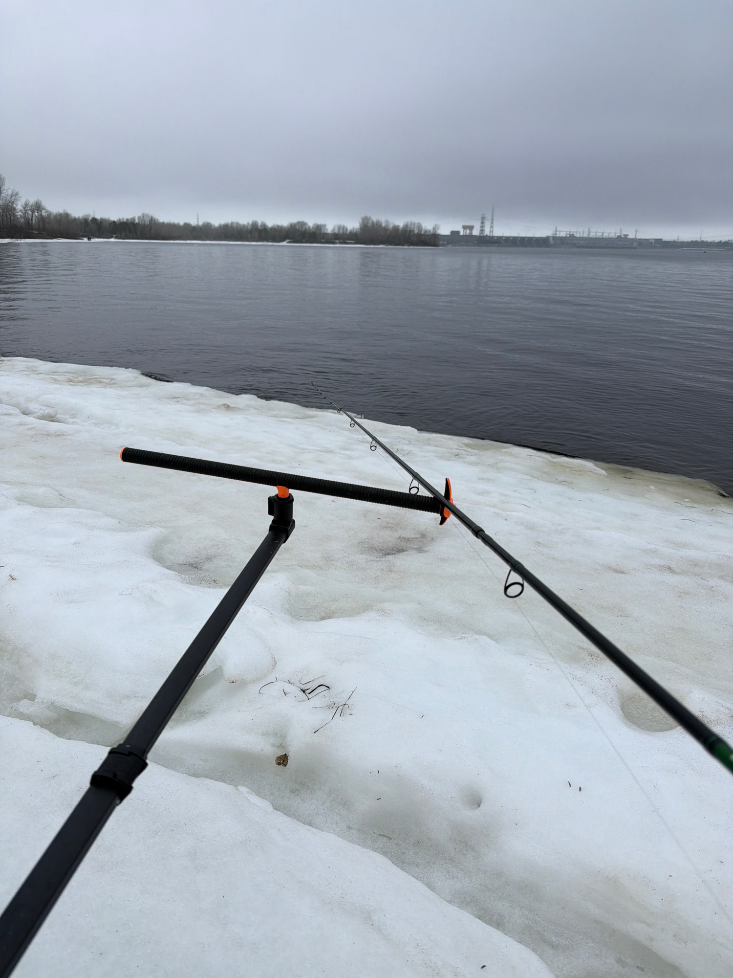 The image shows a fishing rod set up on a snowy bank, likely along the Volga River in Noviy, Russia. The rod is supported by a black stand with orange accents, and the line extends towards the water.…read more