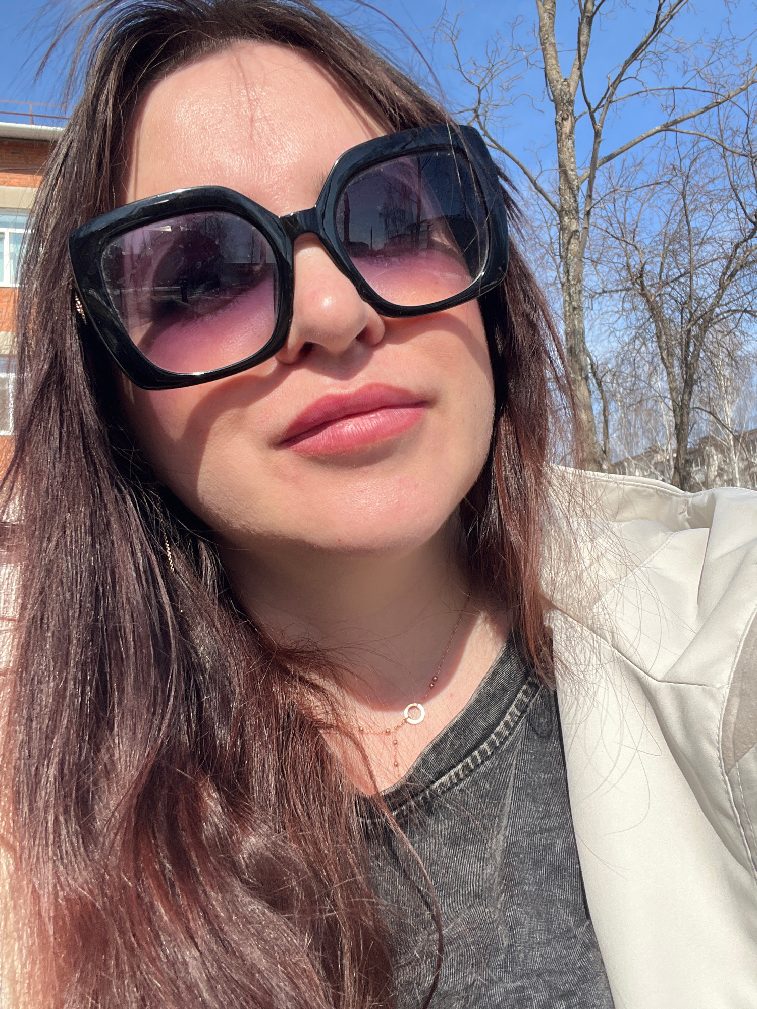 A photograph shows a fair-skinned woman wearing large, black-rimmed sunglasses with a purple tint, a gray denim shirt, and a cream-colored quilted jacket. She has dark brown hair and is wearing a deli…read more