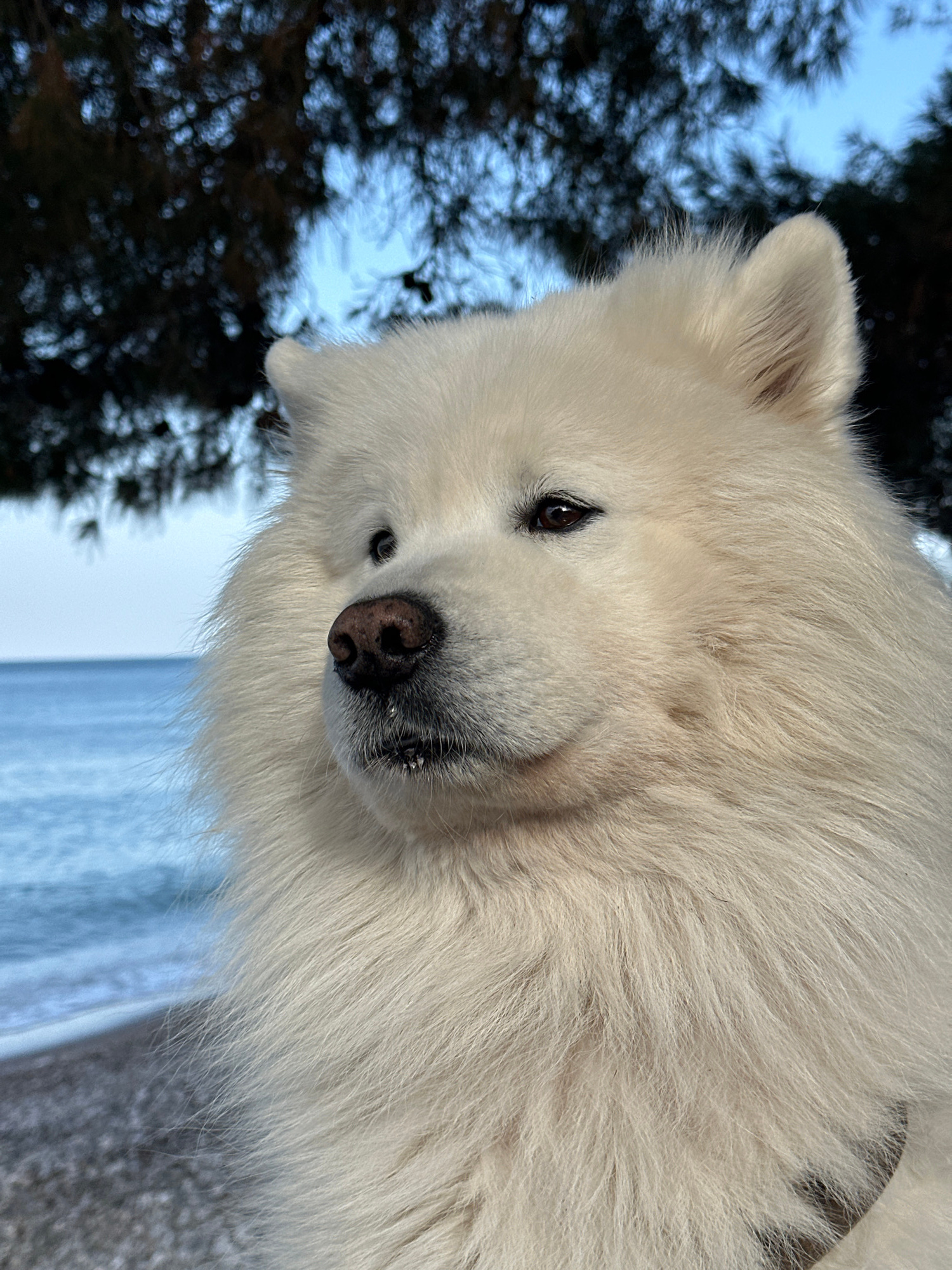A close-up portrait features a fluffy white dog, likely a Samoyed, as the main subject. The dog's head and part of its body dominate the frame, with its dark eyes and black nose standing out against i…read more