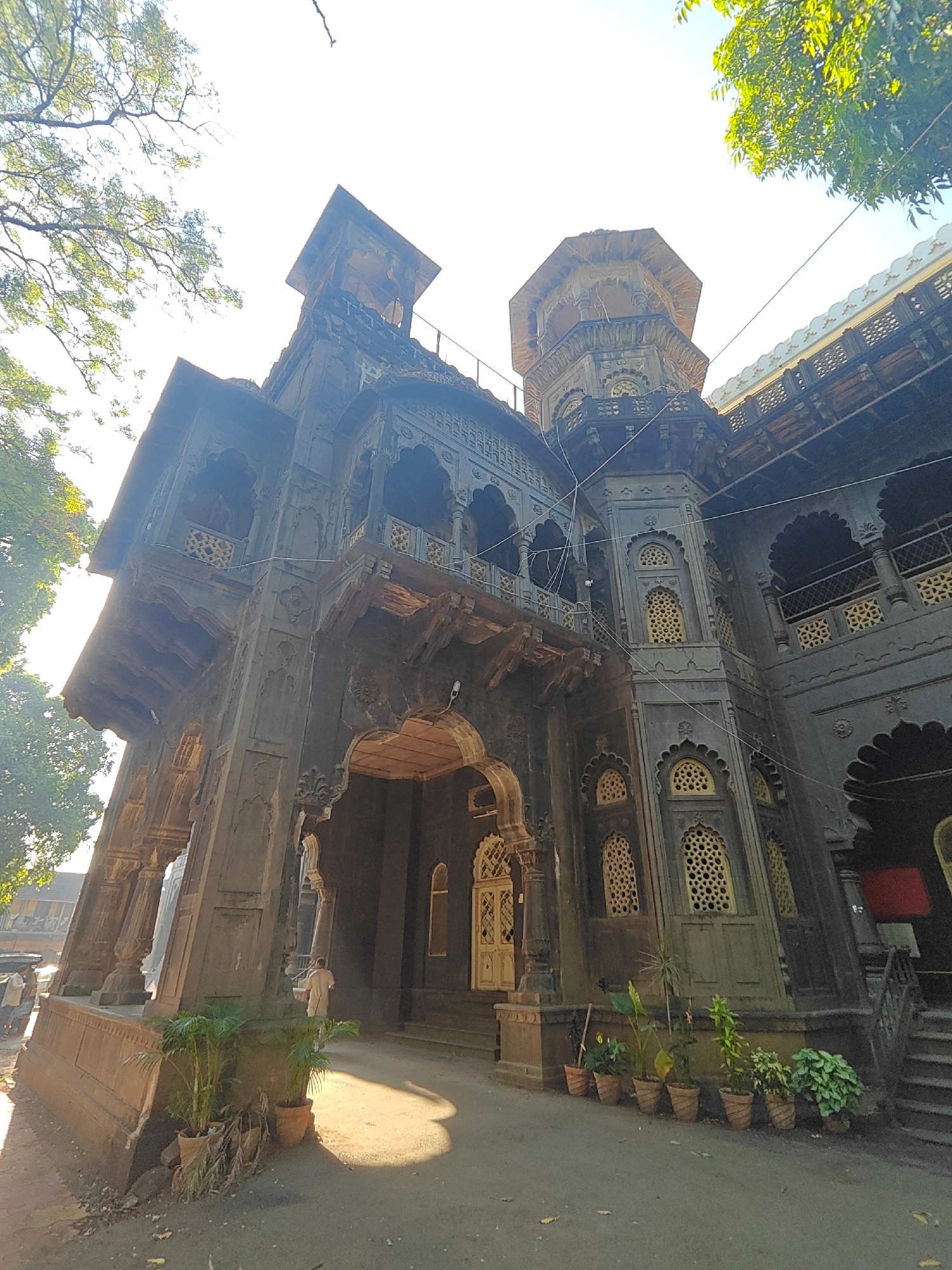 The image shows a low-angle view of the New Palace (Maharaja's Palace) in Kolhapur, India. The structure, constructed from dark grey stone, features intricate carvings, archways, and multiple levels w…read more