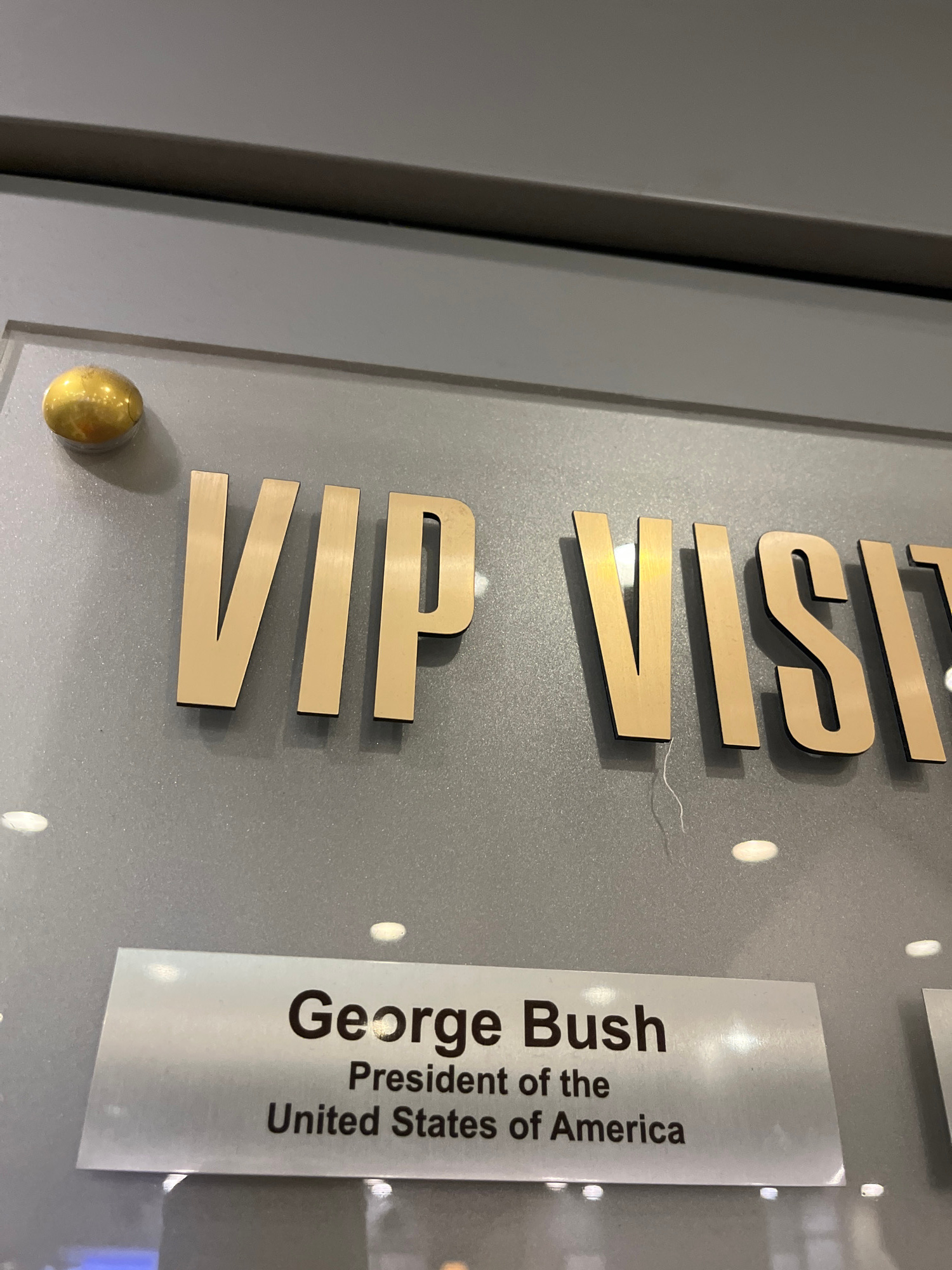A vertically-oriented close-up shot shows a sign that reads "VIP VISIT". Beside it is a smaller placard identifying "George Bush, President of the United States of America." There is a golden knob bel…read more