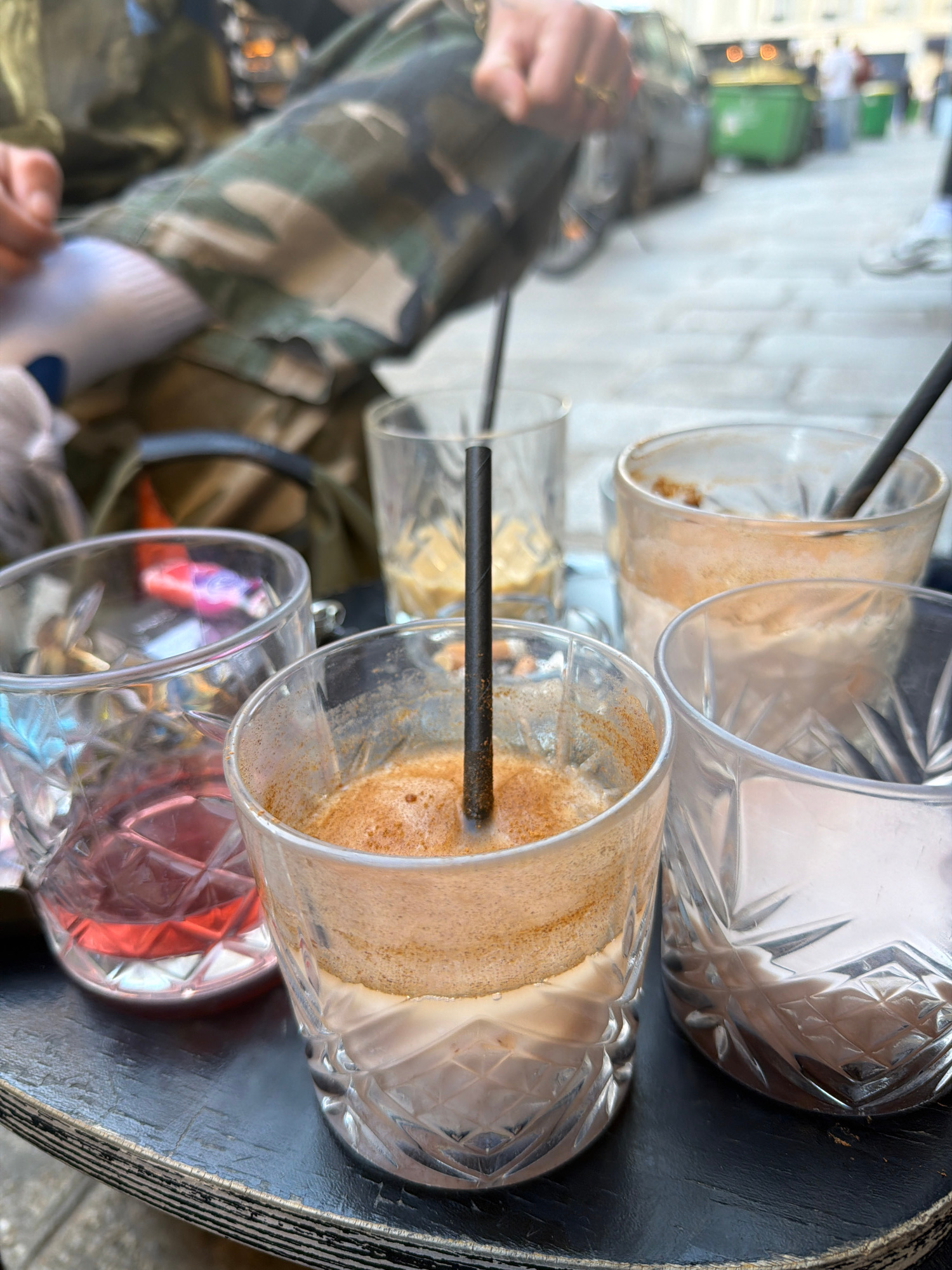 The image presents a close-up view of a round, black table on which four ornate, clear glasses are arranged. Each glass contains varying amounts of liquid, with two showing remnants of a beige, coffee…read more