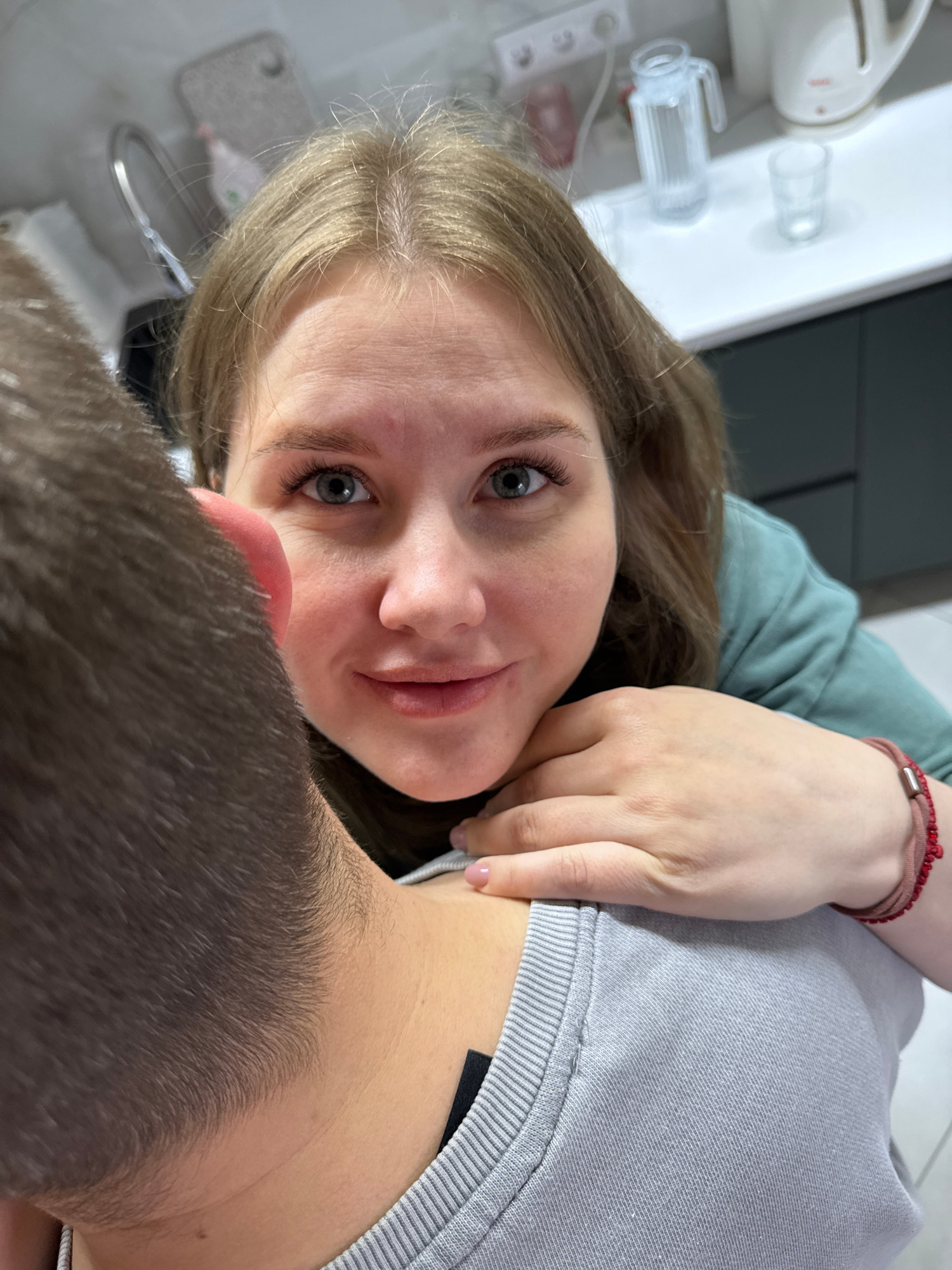 This close-up, angled portrait captures two individuals indoors in Gornyi (Dvurechenskoe S/P), Russia. The primary subject is a young woman with long, light brown hair and striking blue-grey eyes, loo…read more