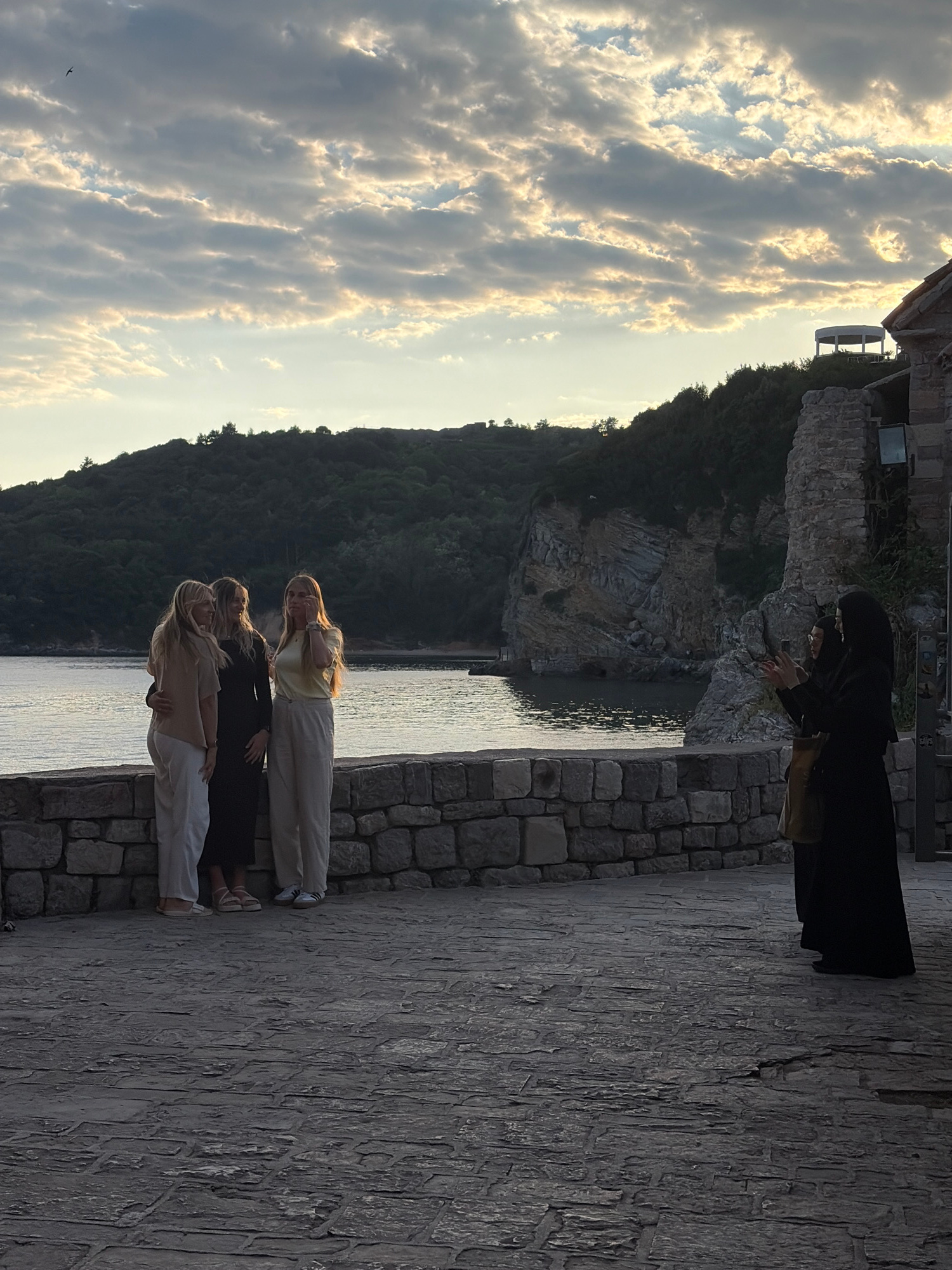 The image depicts a scene in Budva, Montenegro. In the foreground, three light-haired women stand on a stone-paved path next to the water. One woman is wearing a light yellow shirt, while another is w…read more