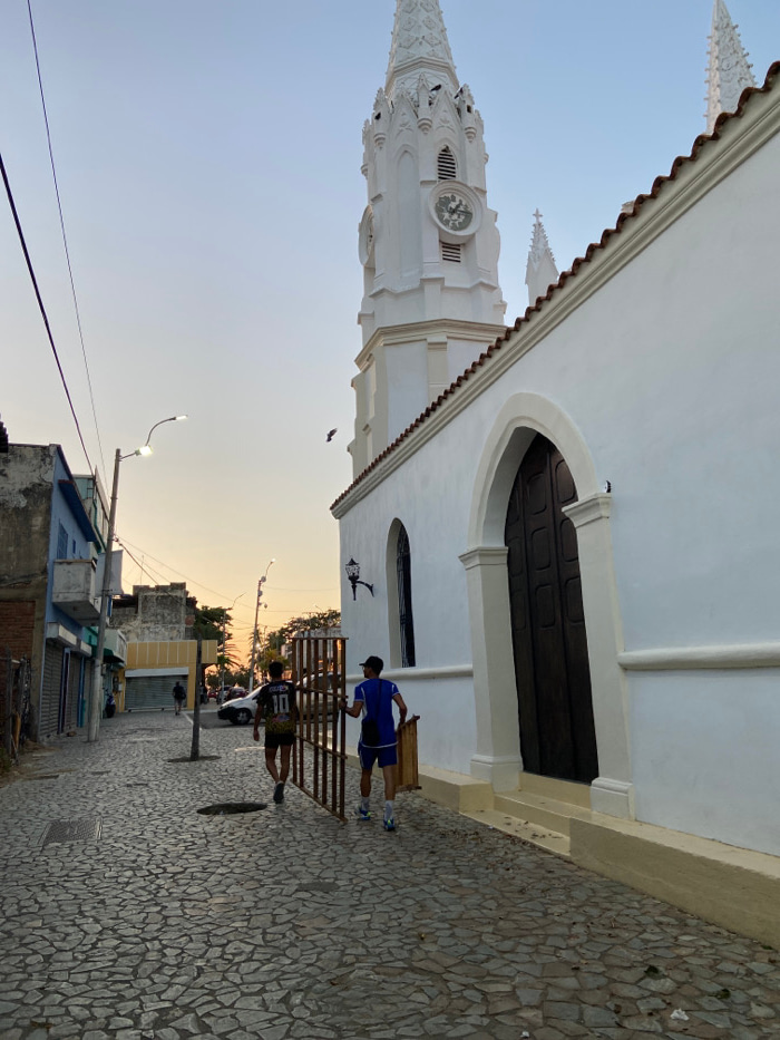 This image depicts a street scene in Juan Griego, Venezuela, during the early evening or late afternoon. On the right, the white Basílica Menor Nuestra Señora del Valle is prominently featured, charac…read more