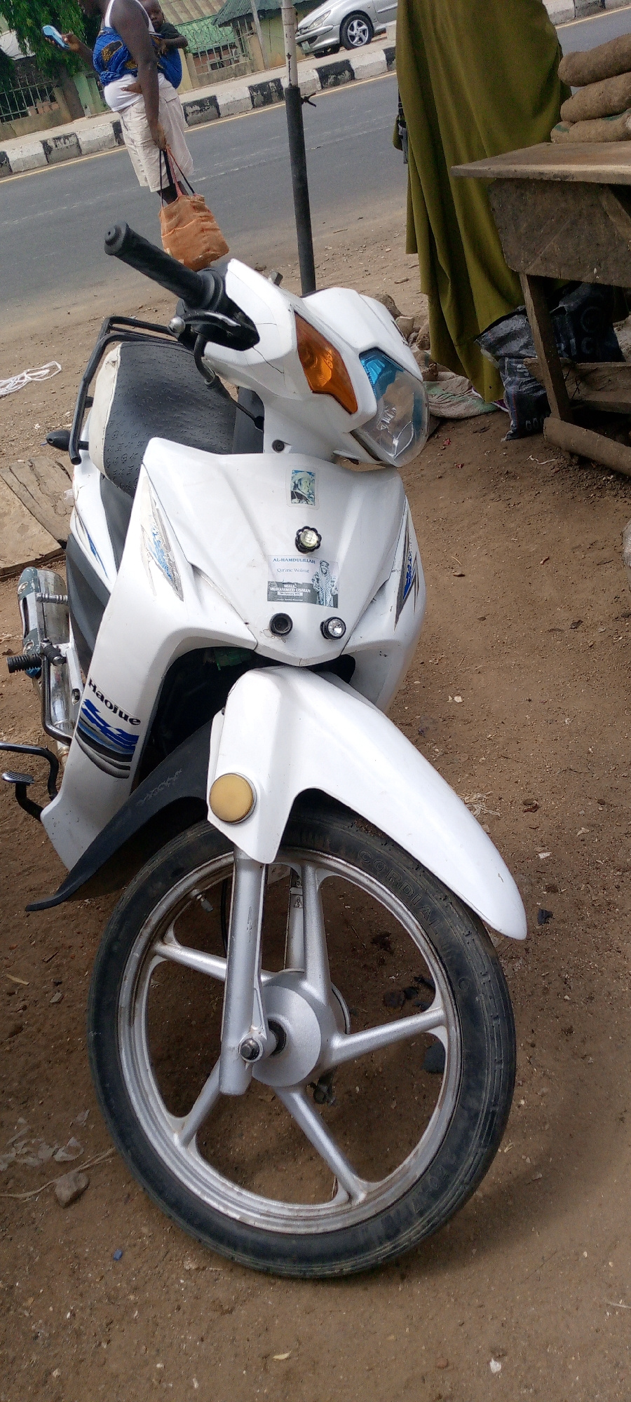 A white Haojue motorcycle is parked on a dirt surface, likely at the edge of a street in Zango-ndaji, Nigeria. The motorcycle is facing the camera, with its front wheel prominently displayed. It has a…read more